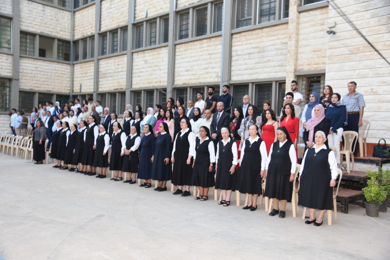 وكانت لوحات فنية لطلاب من الثانوية ، ثم ألقت رئيسة الثانوية الأخت ماري توما كلمة قالت فيها: يطيب لي، بل ويشرّفني أن نلتقي اليوم في محراب الكلمة والحرف، في صرح امتدّت جذوره عميقاً في نفوس المحبّين، قبل أن يمتدّ في ثنايا الزمان والمكان، وجامعنا رابط المحبّة والعلم، مع رائد من روّاد التربية والتعليم، و لن أسدي لكم اليوم نصائح ايها الطلاب، فقد سمعتموها كثيراً من أهلكم ومعلّميكم، وإنما سأكتفي لأذكّركم بما ستواجهونه في معترك الحياة من مصاعب، ولكن، بزاد الخير والمحبّة والمعرفة، وبوقوفكم بجانب الحق تذلّلون ما يعترض مسيرتكم، وتفتحون كوّة في جدار المستقبل. فعليكم الرجاء وعليكم الأمل. فانطلقوا إلى دروب النجاح معزّزين بالإيمان والعلم، ومدّوا جسور التواصل بينكم، فأنتم أمل الحاضر وبناة المستقبل. ثقتنا بكم كبيرة ما دمتم تحملون لواء العلم بيد وبالأخرى لواء الإنسان. أنتم أبناء النّور والحقّ والحياة، ولا تنسوا أن تحملوا النبل والرقيّ، شعار تخرّجكم، وشماً على صدوركم أينما حللتم، تهزأون بالصّعاب، وتجتازونها لتشرقوا شموساً فوق القمم كلّ صباح.