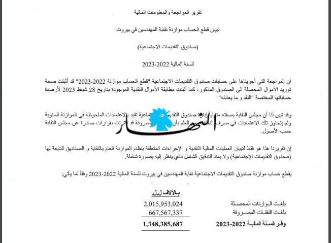 لكن استطراداً، لا بدّ من الإشارة إلى أن نقابة المهندسين تحتوي على 3 صناديق: الأول: صندوق النقابة. الثاني: صندوق التقديمات الاجتماعية. الثالث: صندوق التقاعد. وهذه الصناديق ولو أنها تتبع للنقابة، إلا أن ذمتها المالية منفصلة تماماً عن بعضها البعض.