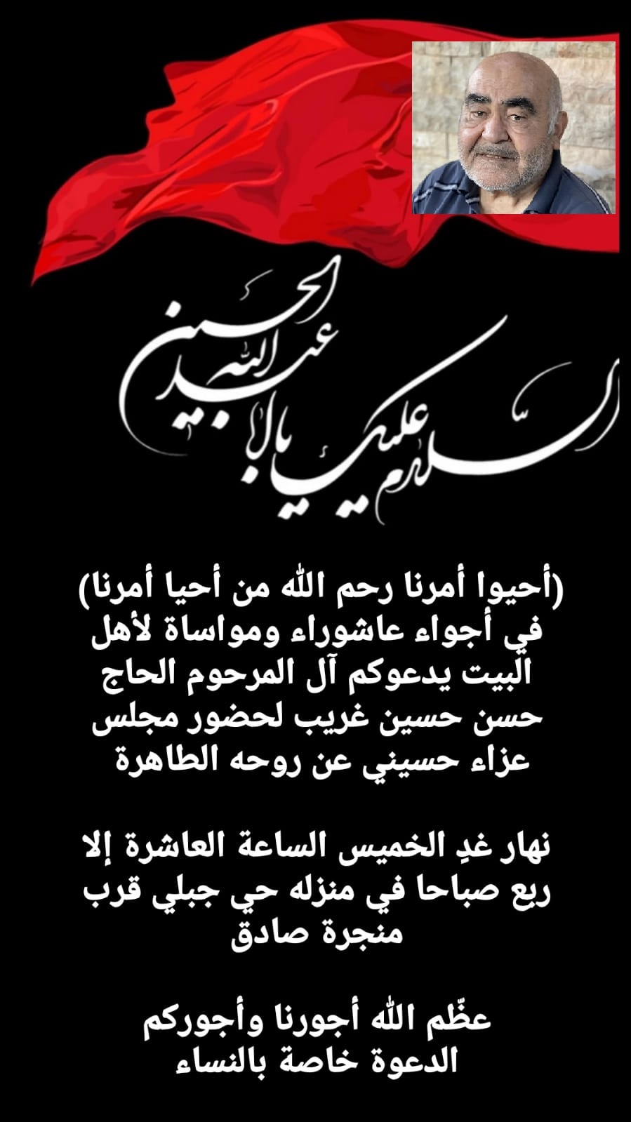 في أجواء عاشوراء، دعا آل المرحوم المربي الحاج حسن حسين غريب (أبو باسل) لحضور مجلس عزاء حسيني عن روحه الطاهرة.