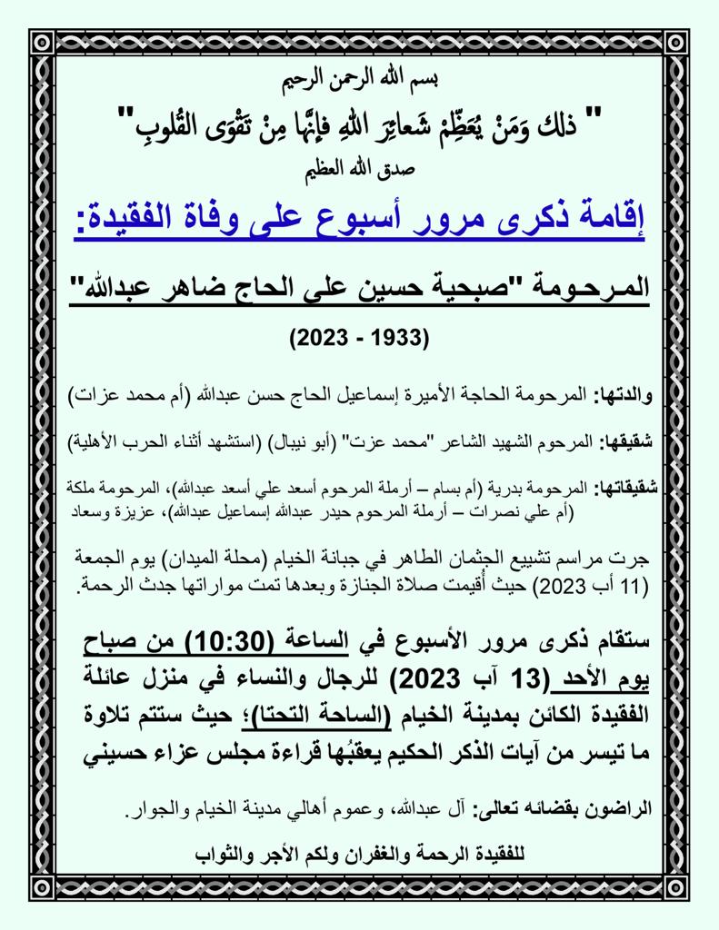 ستقام ذكرى مرور الأسبوع في الساعة (10:30) من صباح يوم الأحد (13 آب 2023) للرجال والنساء في منزل عائلة الفقيدة الكائن بمدينة الخيام (الساحة التحتا)؛ حيث ستتم تلاوة ما تيسر من آيات الذكر الحكيم يعقبُها قراءة مجلس عزاء حسيني
