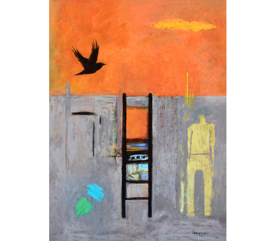 الطائر في العمل، إذاً، على علاقة بهذا السلّم. وهذا الكائن ليس بحاجة لسلّم للارتقاء والانتقال، بعكس الإنسان. جناحا الطائر هما السلّم. لم يحتمل الإنسان حرّيّة هذا الطائر، فحجزه في قفص ووضع له سلّماً ليقف عليه، داخل هذا القفص! قد نغبط الطائر في حركاته وحرّيّته. فهو، على سبيل المثال، ليس بحاجة لجواز سفر وفيزا لعبور الأوطان، أو التمتّع بجمالات الأرض والكوكب.. وهناك أيضاً خيالات الأشخاص والوجوه التي ترمز إلينا بغياب تفاصيلها ودوالها.. والألوان والمساحات والأشكال وتداخلها، التي ترمز للأرض والسماء والطبيعة والأمل والحزن والمخاض..