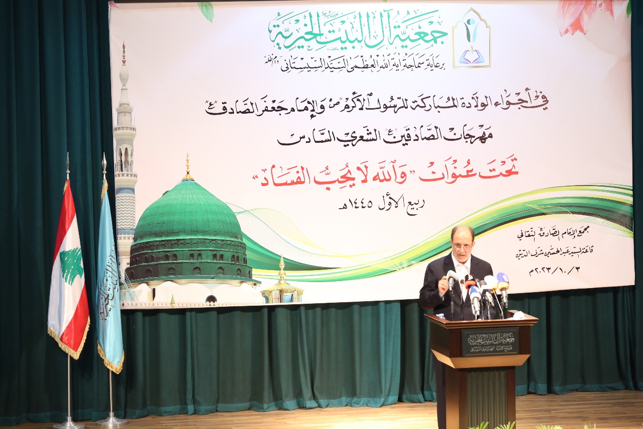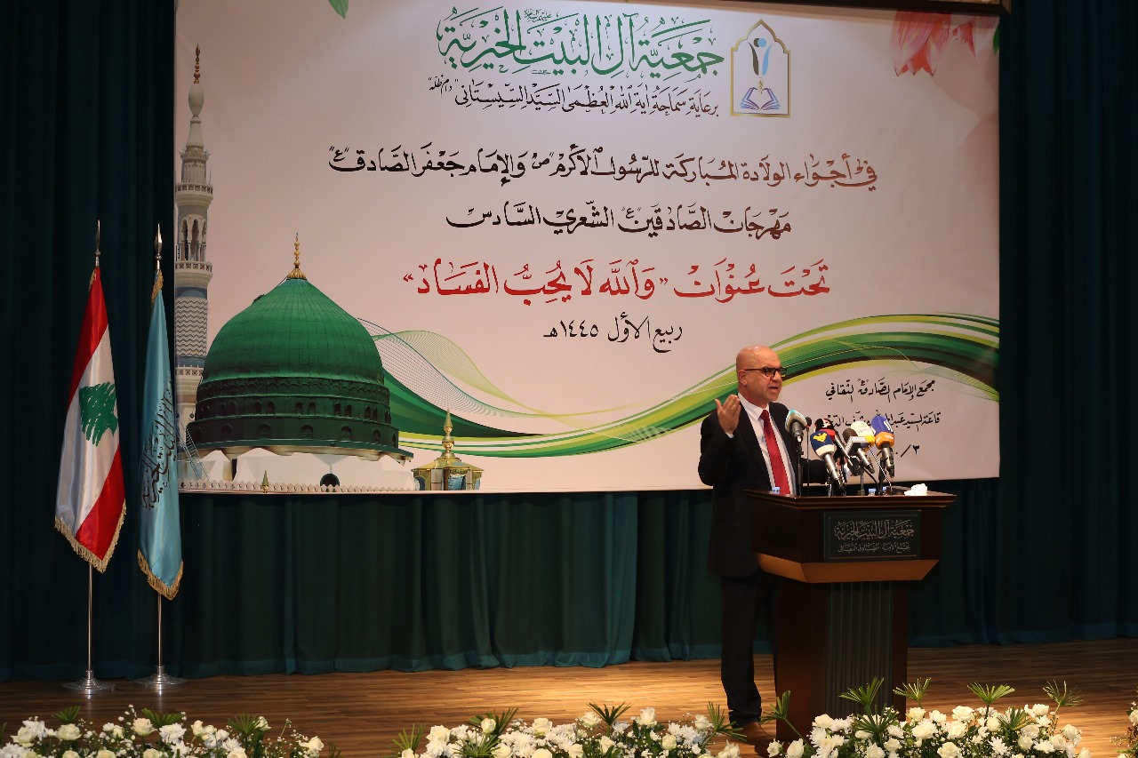 أقامت جمعية "آل البيت" الخيرية في بيروت، في أجواء ولادة الرسول الأكرم والإمام جعفر الصادق، "مهرجان الصادقين الشعري" السادس بعنوان "والله لا يحب الفساد"، في حضور النائب قبلان قبلان ممثلاً رئيس مجلس النواب نبيه بري، الأب عبدو أبو كسم ممثلاً البطريرك الماروني الكاردينال مار بشارة بطرس الراعي، الشيخ بلال الملا ممثلاً مفتي الجمهورية اللبنانية الشيخ عبد اللطيف دريان، الشيخ محمد شقير ممثلاً نائب رئيس المجلس الاسلامي الشيعي الأعلى الشيخ علي الخطيب، الشيخ كمال أبي المنى ممثلاً شيخ العقل لطائفة الموحدين الدروز الشيخ سامي أبي المنى، وزير الثقافة في حكومة تصريف الاعمال القاضي محمد وسام المرتضى، والنواب: علي حسن خليل، الدكتور إيهاب حماده، حسين جشي، الدكتور قاسم هاشم والدكتور أشرف بيضون، العلامة الشيخ محمد كوثراني ممثلاً ألامين العام لـ"حزب الله" السيد حسن نصرالله، المفتي الجعفري الممتاز الشيخ أحمد قبلان، السفير العراقي أمين نصراوي ، العميد مرشد سليمان ممثلاً المدير العام للأمن العام بالإنابة اللواء الياس البيسري ،رئيس المحاكم الجعفرية العلامة الشيخ محمد كنعان، اللواء عباس ابراهيم، مفتي وإمام مدينة النبطية الشيخ عبد الحسين صادق، السفير العراقي أمين نصراوي، الى نواب ووزراء سابقين وممثلي مرجعيات دينية ومفتين وقضاة وعلماء الحوزات العلمية وشخصيات أدبية وثقافية وأكاديمية ودبلوماسية وإعلامية وقضائية وأمنية وعسكرية وبلدية واجتماعية وحشد من المهتمين.