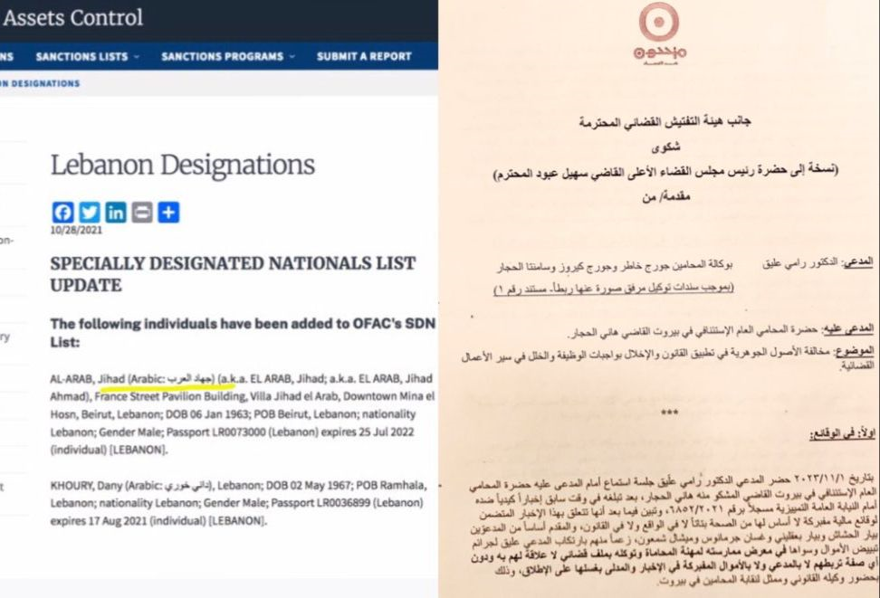 من خارج أي سياق قانوني ومن دون تحديد طبيعة جلسة الاستماع إلى المحامي علّيق أو توجيه تهمة محددة إليه، حصر القاضي المشكو منه الجلسة المذكورة بسؤالٍ واحدٍ عن موضوع يتعلق بالمتعهد جهاد العرب، ما أثار استغراب علّيق والمحامي جورج خاطر من تحالف متحدون الحاضر معه، كون الأمر لا يزال في عداد نزاع قضائي عالق أمام القضاء لا سيّما بعد ادعاء النيابة العامة البيئية في جبل لبنان وكذلك النيابة العامة البيئية في الشمال على العرب وشركته ورفاقه بموجب ورقة طلب أمام قضاء التحقيق، حيث تُعقد جلسات التحقيق حالياً أمام قاضي التحقيق في جبل لبنان بسام الحاج الذي يُنتظر أن يحدد موعد جلسة للبت بالدفوع الشكلية بعد عدم انعقاد جلسة ٢٧ أيلول الفائت بسبب حلول عيد المولد النبوي الشريف، وأمام قاضي التحقيق الأول في الشمال سمرندا نصّار التي يُنتظر أن تحدّد موعداً لجلسة التحقيق التالية في الملف، علماً بأن البعض أثار خبر انعقاد جلسة تحقيق في ملف نفايات المنية حضرها العرب شخصياً لكن لم يجرِ إبلاغ الجهة المدّعية بها، الأمر الذي لا يستقيم والمهنيّة المشهودة للقاضية نصّار في متابعة ملفّي نفايات طرابلس والمنية.