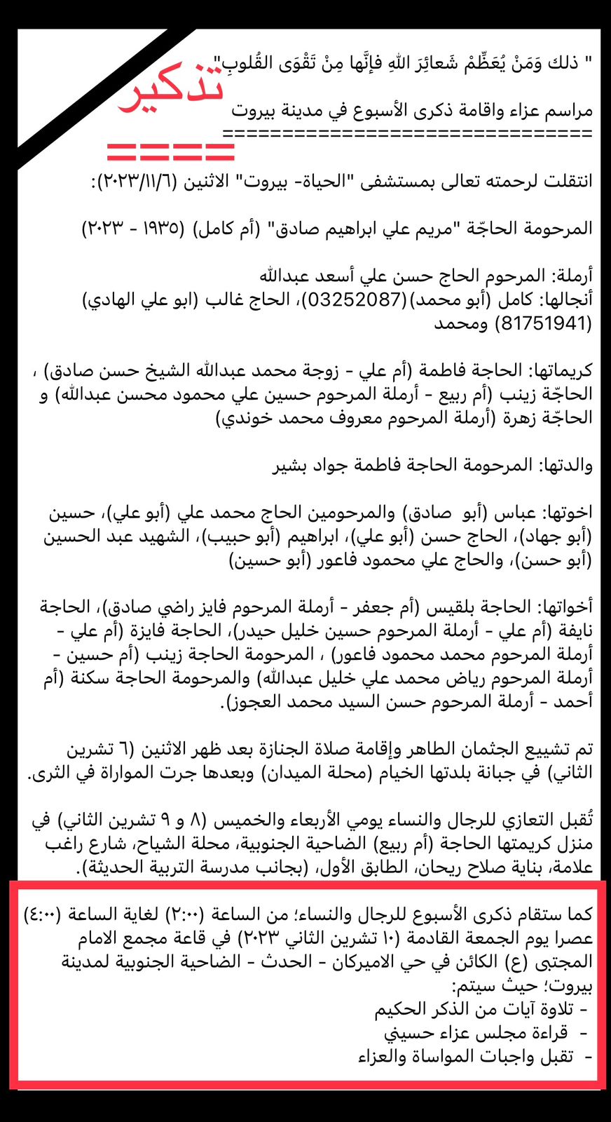 تقام ذكرى الأسبوع للمرحومة الحاجّة مريم علي ابراهيم صادق (أم كامل عبدالله) في ضاحية بيروت الساعة الثالثة بعد ظهر يوم الجمعة 10 ت2 2023 في قاعة الامام المجتبى في حي الامريكان.