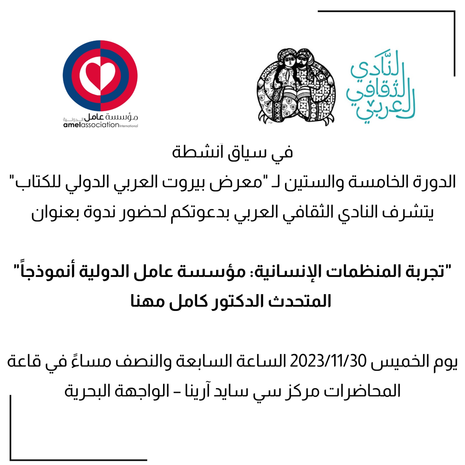 ينظّم النادي الثقافي العربي، في سياق أنشطة الدورة الخامسة والستين لـ "معرض بيروت العربي الدولي للكتاب"، ندوة بعنوان «تجربة المنظمات الإنسانية: مؤسسة عامل الدولية أنموذجاًً» والتي يتحدث خلالها الدكتور كامل مهنا رئيس مؤسسة عامل الدولية حول أبعاد هذه التجربة وغنى لبنان بالمؤسسات الإنسانية التي لعبت دوراً مهماً في مواجهة الحرب الأهلية والاحتلال الاسرائيلي وغيرها من المحطات التاريخية في تاريخ البلاد، وساهم التزام وعمل تلك المؤسسات بتعزيز التماسك الاجتماعي للنسيج اللبناني في مواجهة عوامل التفتيت والهدم.