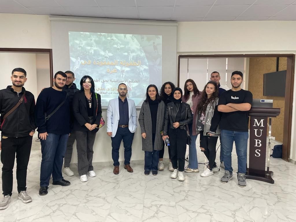 نَظَّمَ مكتب النَّجاح الطلابي وقسم الحياة الجامعية في الجامعة الحديثة للإدارة والعلوم MUBS ، مُحاضَرة تناوَلَت موضوع "حقوق الطفل في مناطق الحرب: فلسطين كحالة، في قاعة احتفالات الحرم الجامعي- فرع بدارو، يوم الجمعة الواقع في الخامس عشر من شهر كانون الأول.