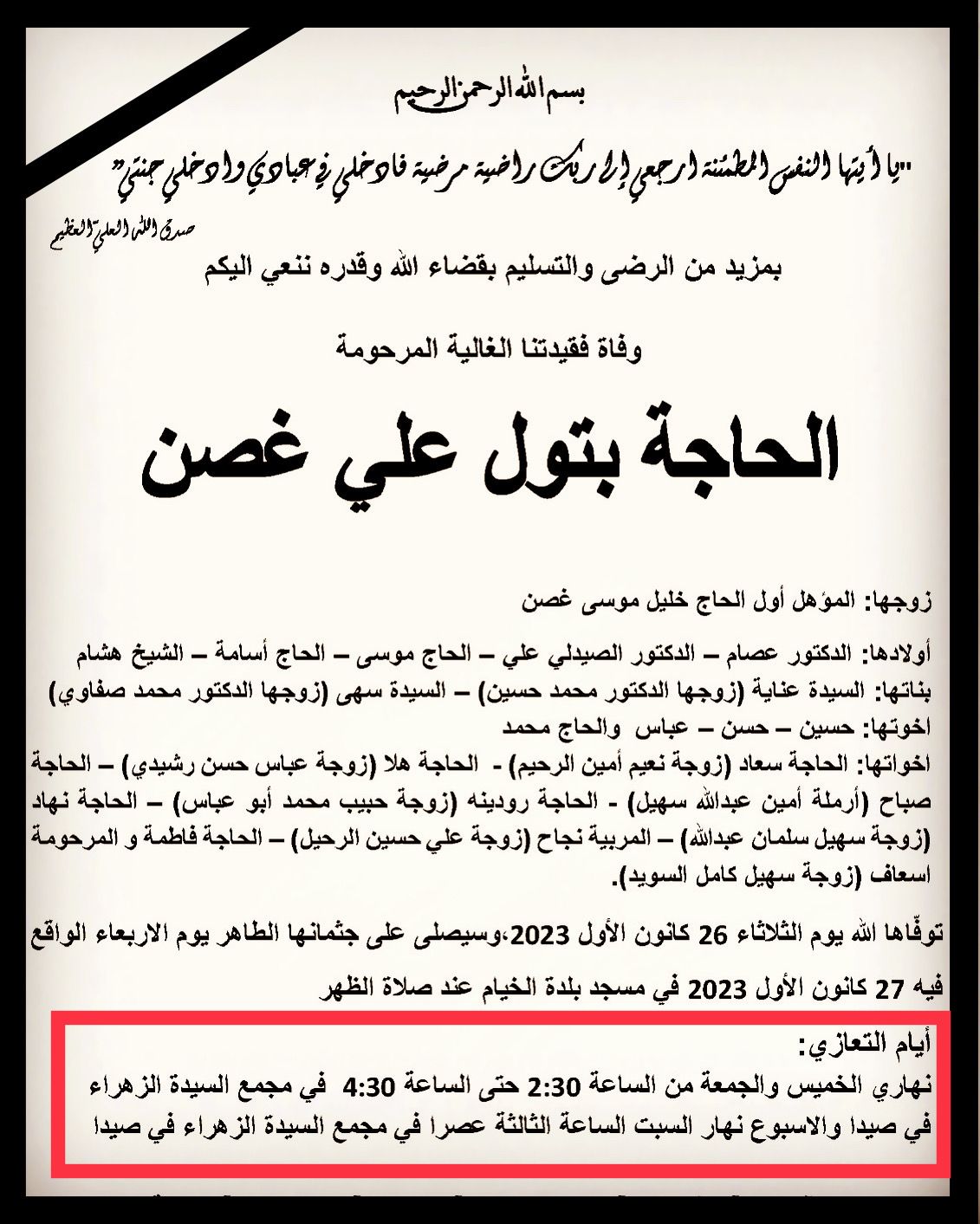 يتقبلون التعازي في صيدا يومي والخميس والجمعة 28 و29 ك1 2023 بمجمع السيدة الزهراء (عليها السلام) من الساعة الثانية والنصف بعد الظهر حتى الساعة الرابعة والنصف عصراً.