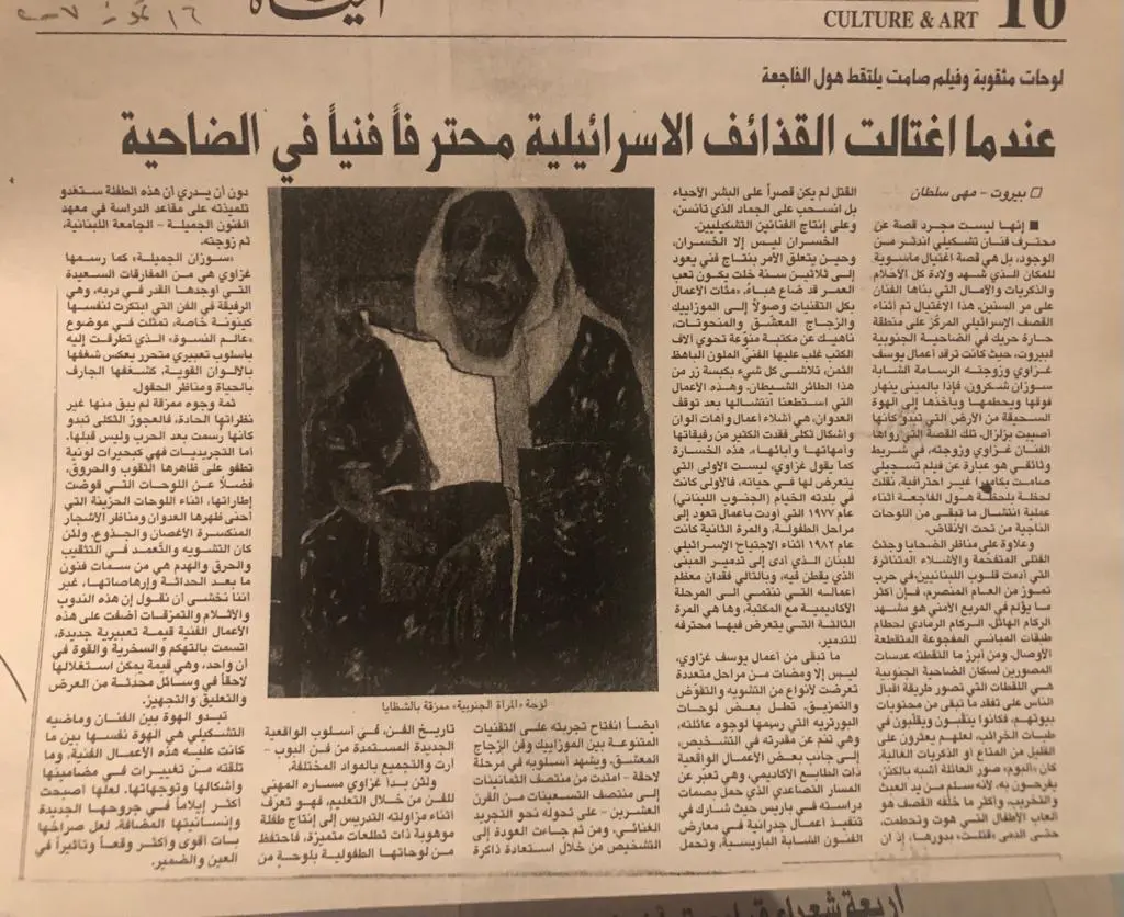 ضياع الإرث التشكيلي للفنان غزاوي شكّل صدمة كبيرة جدًّا له ولزوجته، حيث بدأوا رحلة البحث عن مِزَق اللوحات بين الركام، ليجمع الزوجان بعض الأقمشة المشظّاة، ويقدّمانها في معرض استثنائيّ بموضوعه وشكله، تحت عنوان “اغتيال محترف”، في صالة قصر الأونيسكو في بيروت. يقول: “في حينه، تقاطرت وسائل الإعلام لتغطية هذا الحدث، وكأنّ العدسات تعاين جثثًا موشّاة بالرماد”.