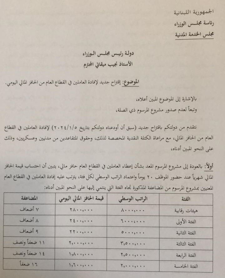 ويتضمن الإقتراح الجديد (المستند المرفق) للحوافز المالية خفضاّ بنسبة تقارب 50 في المئة من الحوافز السابقة بالإضافة إلى تعديل قيمة بدل النقل اليومي للإداريين، ليصبح 900 ألف ليرة يومياً، أي ضعفي بدل النّقل المعمول به سابقًا والبالغ 450 ألف ليرة. أما للعسكريين، فيبلغ بدل النقل الشهري 10 ملايين ليرة بدلاً من 5 ملايين ليرة.