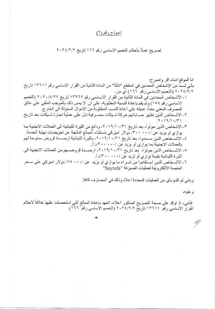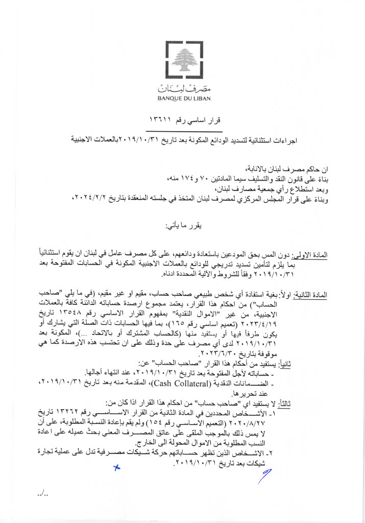 وقد صدر عن "مصرف لبنان" التعميم 166 يتعلق بإجراءات استثنائية لتسديد الودائع المكونة بعد تاريخ 31- 10-2019 بالعملات الأجنبية.