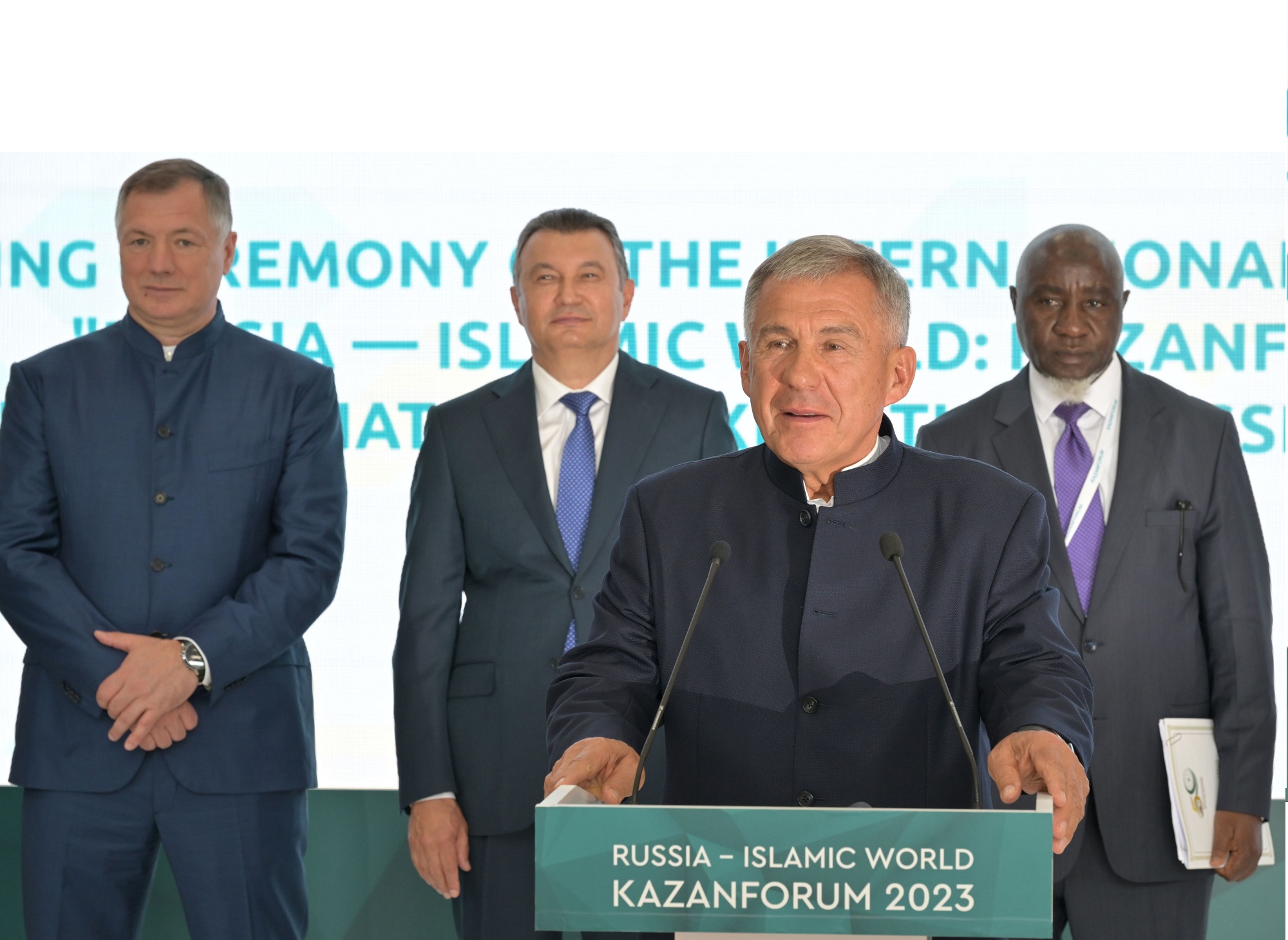 "يمكن أن نرى سعى روسيا على تعميق وتوسيع التعاون مع بلدان العالم الإسلامي، وخير مثال على ذلك جهود جمهورية تتارستان، إحدى المناطق الروسية الرائدة، التي تنجح في إقامة ليس فقط العلاقات التجارية والاقتصادية والاستثمارية، بل تُطور العلاقات الثقافية والإنسانية كذلك. إن جمهوريتنا هي إحدى المناطق الرائدة في مجال إدخال الخدمات المصرفية الإسلامية والتمويل الإسلامي في روسيا؛ ويجري العمل المكثف لتطوير صناعة الحلال والتعليم الإسلامي أيضًا" — جاء في بيان رستم مينيخانوف المكرس لمناقشة آفاق التعاون الواعدة.