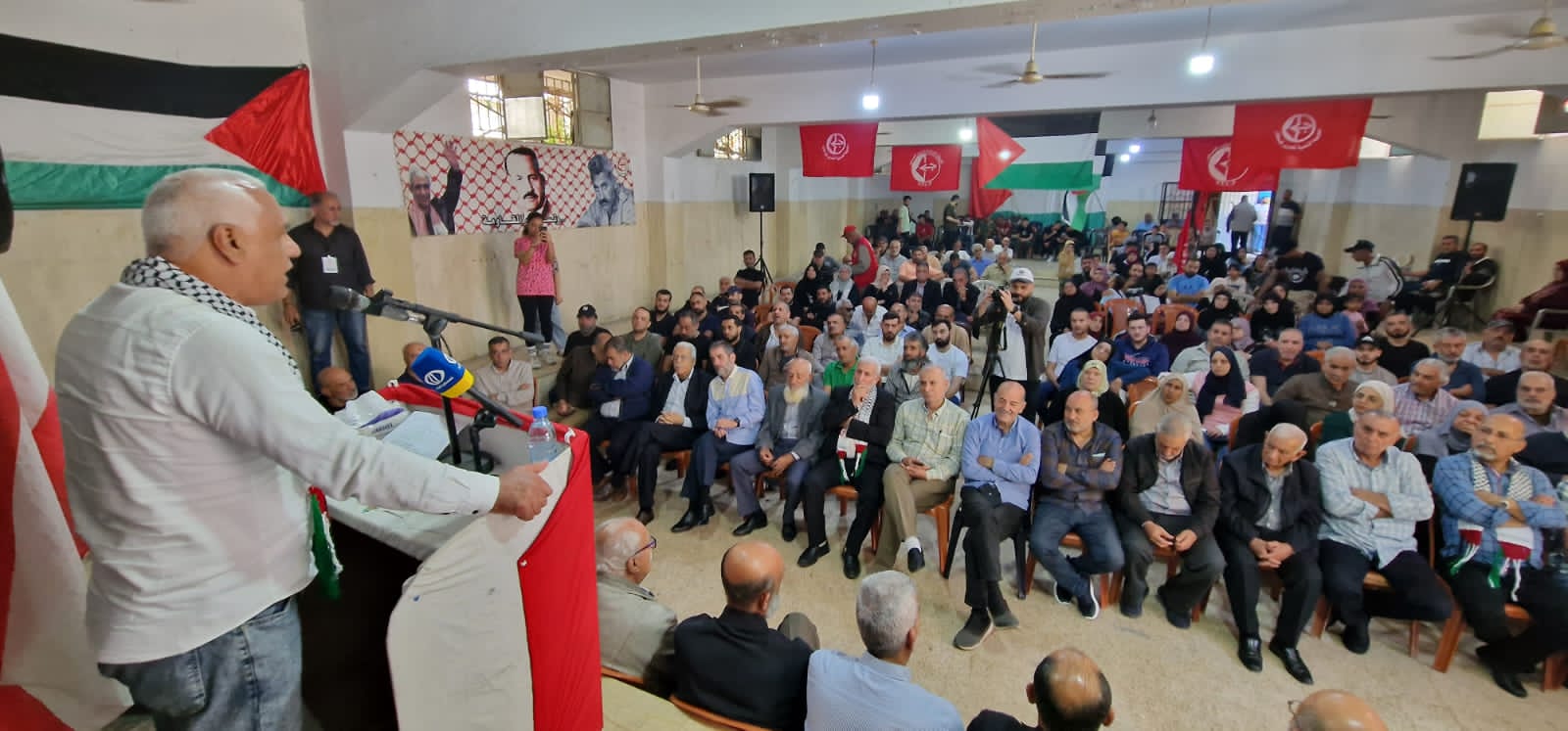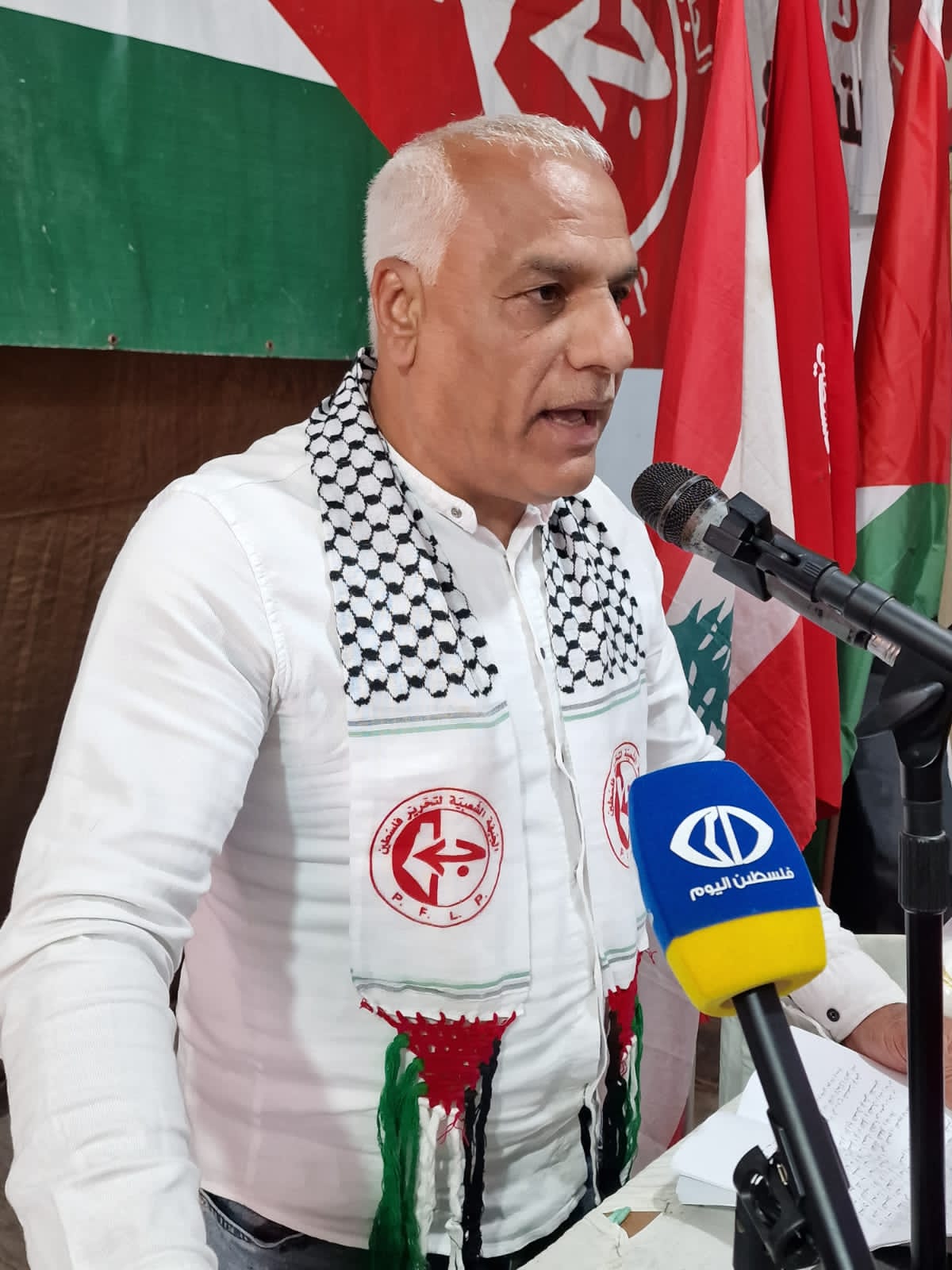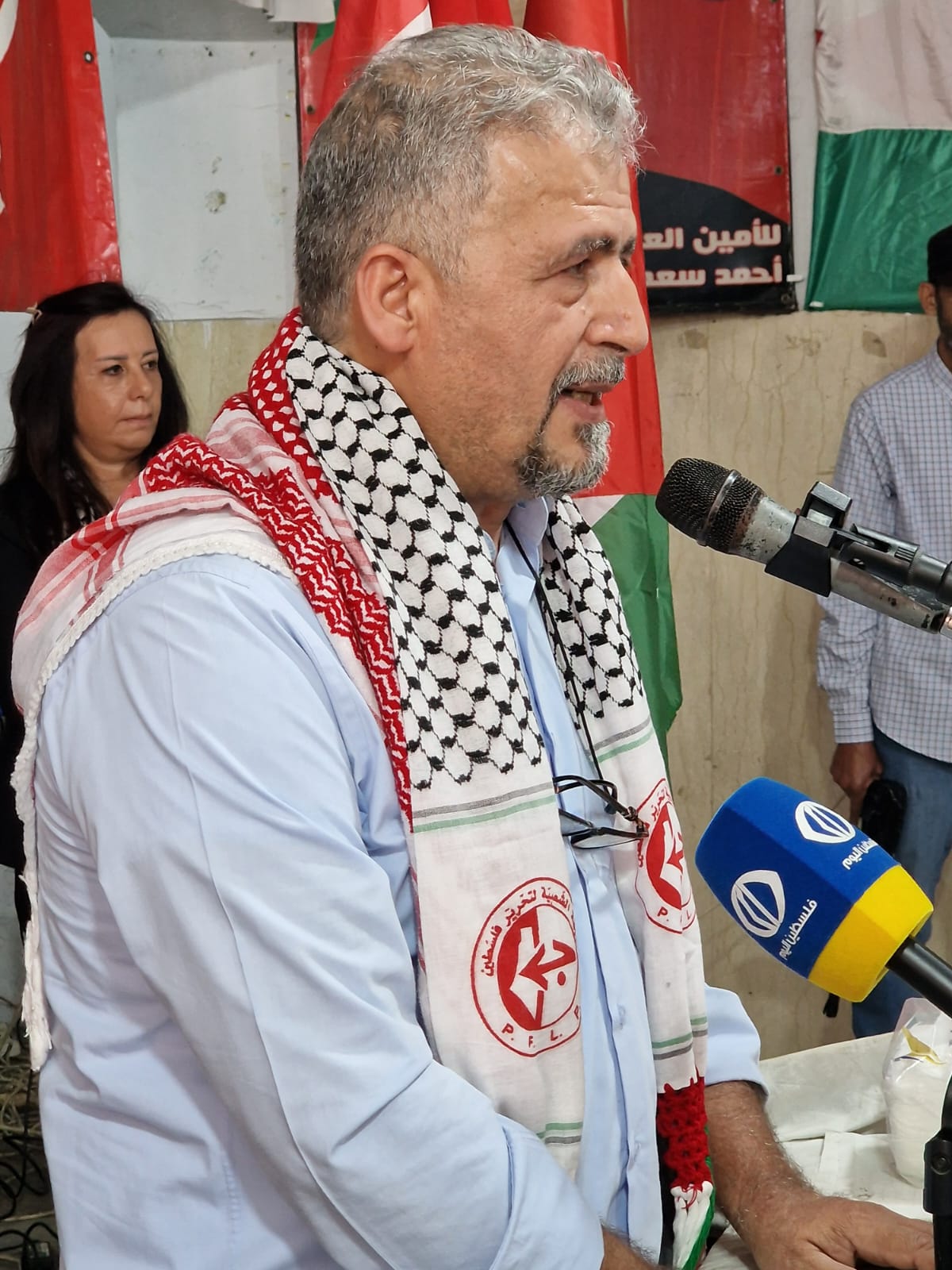 وتابع، من هنا، من عين الحلوة نبعثُ بتحيةِ شموخٍ وكبرياءَ إلى روحِ المناضلِ الوطنيِ الجبهاويِ الكبيرِ والأديبِ والمفكرِ أبو ميلاد، رفيقُ دربِ القادةِ الأبطالِ/ الأمينِ العامِ الرفيقِ أحمد سعدات، ومروان البرغوثي وحسن سلامة، ووجدي جودة، وبسام السعدي، وباسم خندقجي، وعاهد أبو غلمي، وكميل أبو حنيش وكلِ أسرَانا الأبطالِ الصامدين .