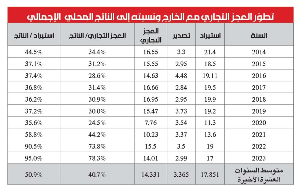 يمثّل الاستيراد في عام 2023 نحو 95% من الناتج المحلي مقارنة مع 36% في سنوات ما قبل الأزمة