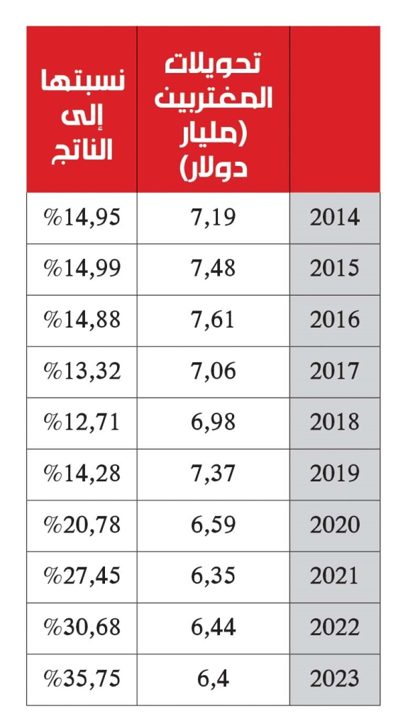 ارتفاع هذه النسبة هو مؤشّر واضح إلى أن الإنتاج في لبنان تدهور، وأن الاعتماد على الإنتاج الخارجي هو أساس الاستهلاك المحلّي، وهو أمر يظهر بوضوح في مقارنة التصدير الذي تراجع إلى مستويات عام 2015. لكنه يظهر بوضوح أكبر في مسألة التمويل، إذ إن تحويلات المغتربين إلى الأسر المحلية لم تتراجع في قيمتها كثيراً بل واصلت التذبذب بين 6.4 و7.4 مليارات دولار في سنوات الأزمة الخمس (2019 - 2023) بمتوسط 6.6 مليارات دولار، لكن نسبتها إلى الناتج المحلي الإجمالي تضاعفت من 14.3% في عام 2019 إلى 35.7% في عام 2023. أي أن الاعتماد على تحويلات المغتربين ازداد أكثر فأكثر. وتمثّل هذه التحويلات، نحو 36% من الدخل الفردي (نصيب الفرد من الناتج) البالغ بحسب البنك الدولي نحو 3350 دولاراً في عام 2023. ووفق حسابات مبسّطة، فإن نصيب الفرد الحقيقي من الناتج الإجمالي بعد إضافة تحويلات المغتربين سيزداد إلى 4580 دولاراً في عام 2023.