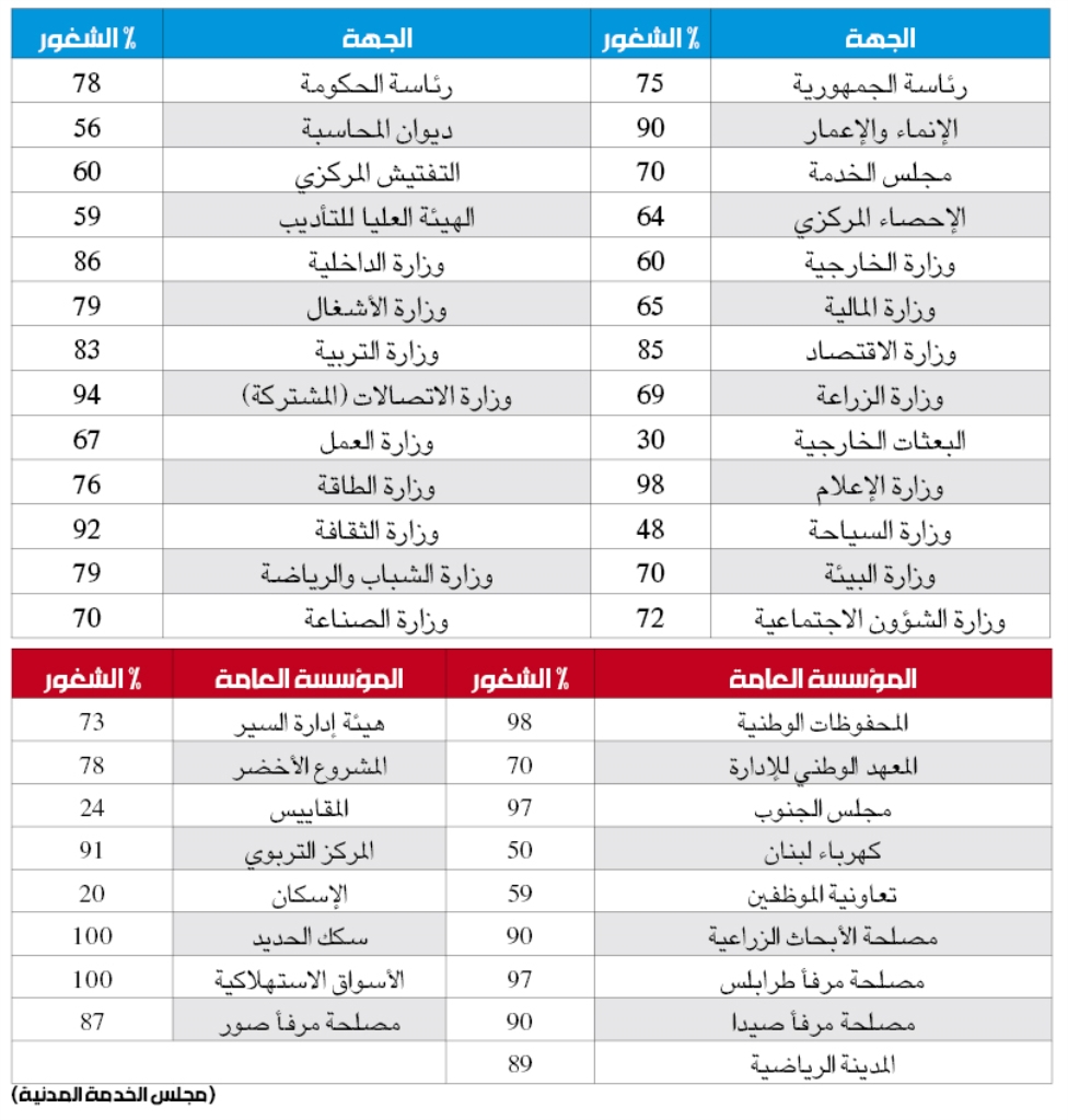 وبعد إنجاز المسح الوظيفي الذي كان شرطاً لإعادة فتح باب التوظيف، وجد المجلس شغوراً بنسبة 70% في كلّ الإدارات العامة، حتى دوائر مجلس الخدمة تعاني الشغور بنسبة 78%، إذ «لا يوجد رؤساء مصالح ودوائر». فالدولة «خسرت الكفاءات» تقول مشموشي. إضافة إلى الراحلين عن الوظيفة لأسباب عائلية «كل الموظفين أصحاب الخبرات الطويلة في العمل الإداري الذين تعاملوا مع المنظمات الدولية يغادرون الوظيفة العامة، وهذه كفاءات نخسرها فعلاً». من هنا فإنّ غاية مجلس استقطاب موارد بشرية كفوءة وقادرة على رفع الأداء الحكومي، والحفاظ على الموارد البشرية الموجودة في الخدمة.