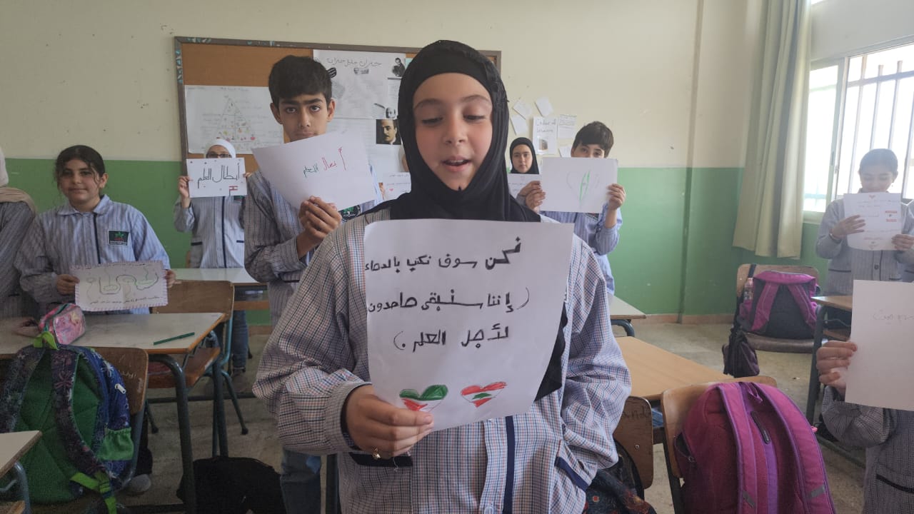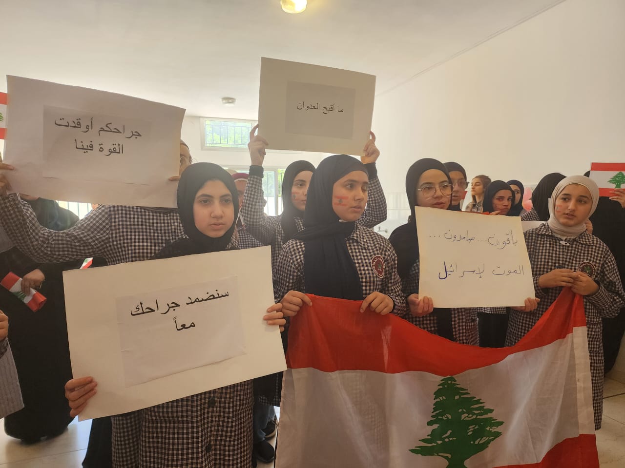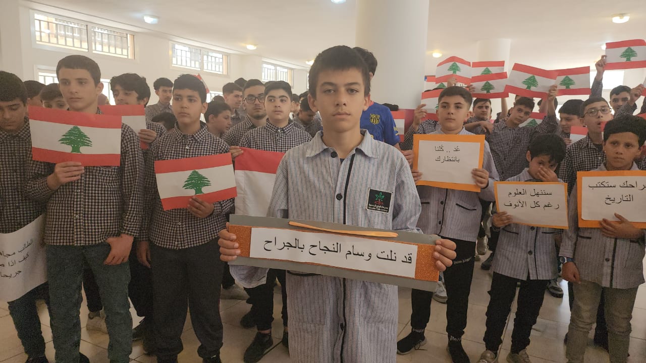 ورفع الطلاب في ملعب المدرسة وداخل الصفوف لافتات كتب على بعضها " لقد نلتم وسام النجاح بالجراح" و " سنضمد جراحكم معا" ، و " جراحكم اوقدت القوة فينا" و " جراحكم سنكتب التاريخ" و" الطالب مجاهد فكيف اذا صار جريحا"، واطلقوا هتافات الموت لاسرائيل.