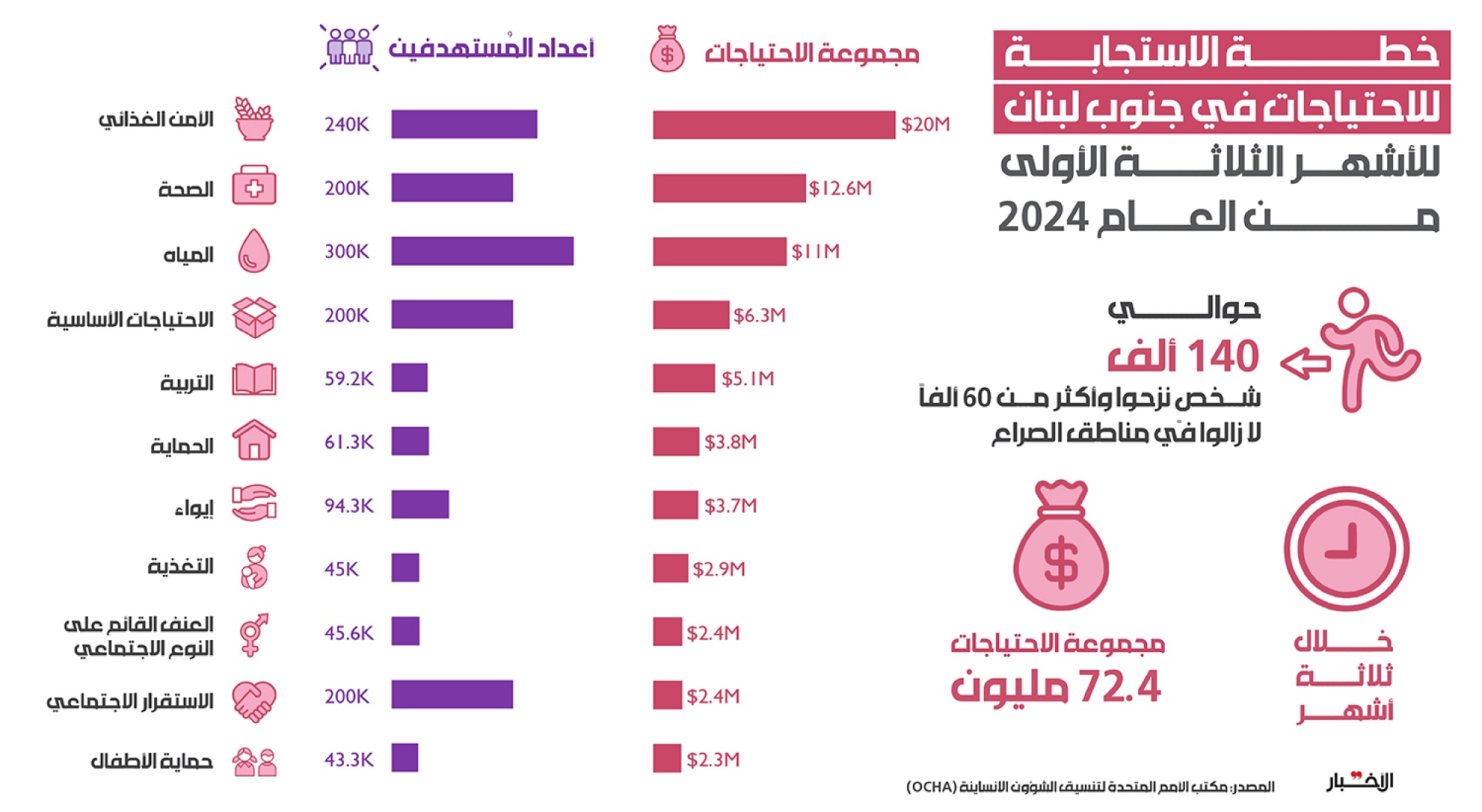 حتى أواخر 2023، لم ترصد الدول المانحة دولاراً واحداً لإغاثة النازحين عن جنوب لبنان تحت وطأة الاعتداءات الإسرائيلية. ووفق مكتب الأمم المتحدة لتنسيق الشؤون الإنسانية (OCHA)، فإنّ هيئات الأمم المتحدة والمنظّمات الدولية العاملة معها، وحتى 31 كانون الأول 2023، قدّمت من «مالها الخاص» ما قيمته 24.6 مليون دولار على صعيد الاستجابة لإغاثة النازحين الجنوبيين، 17 مليوناً منها عبارة عن مبالغ كانت مرصودة لتمويل برامج مختلفة، أعادت الهيئات والمنظمات الدولية توجيهها لأعمال الإغاثة جنوباً. أما بقية المبلغ، أي نحو 7.5 ملايين دولار، فقد سُحبت من أموالٍ تُرصد جانباً في موازنات هيئات الأمم المتحدة وتُستخدم في الحالات الإنسانية الطارئة. وبالتالي، فإن الهيئات أنفقت من أموال موازناتها المُعدّة أصلاً، وسط إحجام الدول المانحة، وفي مقدّمها الولايات المتحدة ودول الاتحاد الأوروبي عن تخصيص تمويلٍ للتدخل الإنساني في الجنوب.