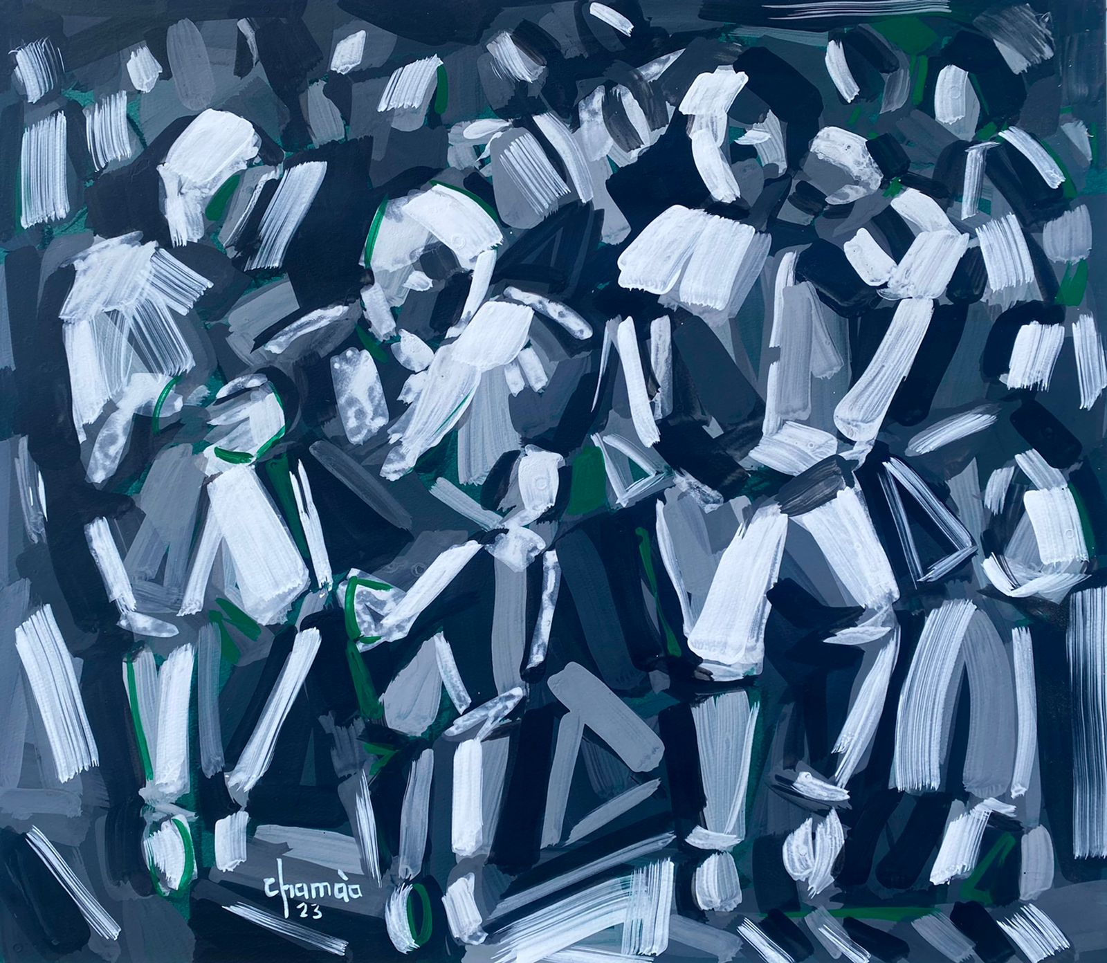 يخاطبنا درويش الشمعة عبر جمهرة أشخاصه المحتشدة، تشبه لوحاته العرس والاحتفال بحدث اجتماعي أو عائلي، حيث الكبار يعانقون صغارهم؛ نساء ورجال يملؤون اللوحة من جهاتها الأربع عبر ضربات لونيّة ومساحات يغلب عليها اللّون الواحد (Monochrome) والأسلوب التكعيبي المحرّر والمنفلت من لعبة الخطّ والزوايا الحادّة.