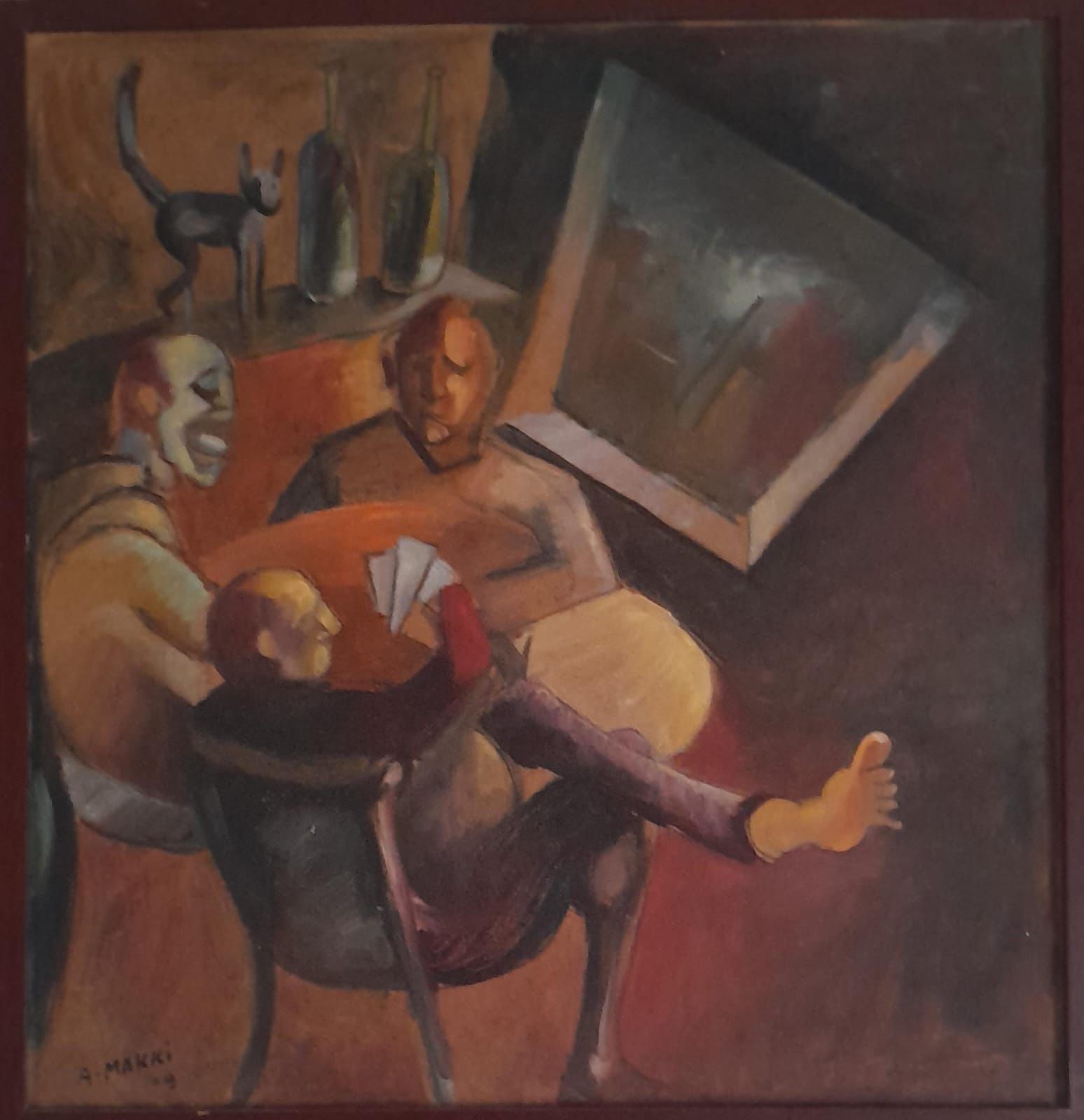 عبّاس مكّي التعبيري بموضوعاته وألوانه الترابيّة، يلف التضاد الضوئي في لوحاته حول مخلوقاتها وتعابير وجوهها وحركاتها. يلجأ إلى تشخيصيّة حرّة لافتة ومحرّرة عبر تأليف محبّب ومنفلت. فهؤلاء الأشخاص الذين يلعبون الورق تكتّلوا عبر تأليف دائريّ لا ينفصم عراه، لتظهر اللّوحة المعلّقة على جانبهم بشكلها الهندسيّ اللامتناسق الأضلاع وهي بمثابة القفص لهم. لوحة لمدخّن يمجّ سيجارته لتظهر منها كتلة دخانيّة ثقيلة تدل على هموم زادت من قوّتها وثقلها العينان المتّسعة حدقتاها وتعابير الوجه الحادّة والصارمة والمؤلمة.