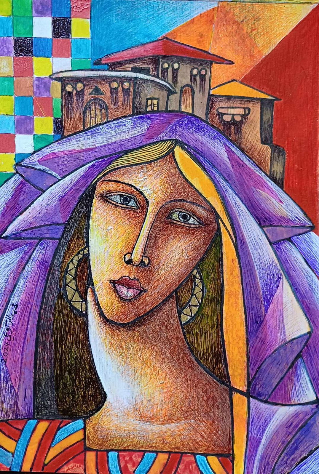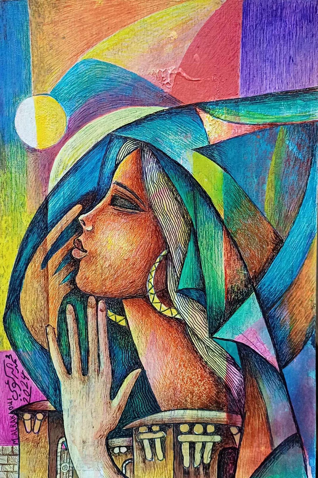تظهر المرأة في أعمال الفلسطيني محمد الركوعي، كما في أعمال باقي الفنّانين الفلسطينيّين، فتصبح رمزاً للقضيّة، تقف بأنوثتها مواجِهةً لنا بعيونها الحالمة تارةً، والشاردة طوراً، أو المحدّقة فينا أحياناً لتتواصل مع المشاهد وتدخله في روحيّة اللّوحة وعناصرها. رقبتها تذكّرنا بأعمال الفنّان الإيطالي موديلياني بطولها وحركتها، سلسلتها موحدة اللّون، ولباسها الشرقيّ بتقطيعاته الهندسيّة، يحاكي شكل المنازل التي تظهر في الخلفيّة، للدلالة على التشبّث بالأرض والانتماء إلى الوطن والهويّة الشرقيّة. نشير هنا إلى أنّ هذا الفنّان أمضى مدة طويلة من عمره في سجون الاحتلال قبل إطلاق سراحه. فنّان ناشط، أبدع أثناء مدة أسره عشرات الأعمال الفنّيّة، وهو عضو في اتحاد الفنّانين الفلسطينيّين.
