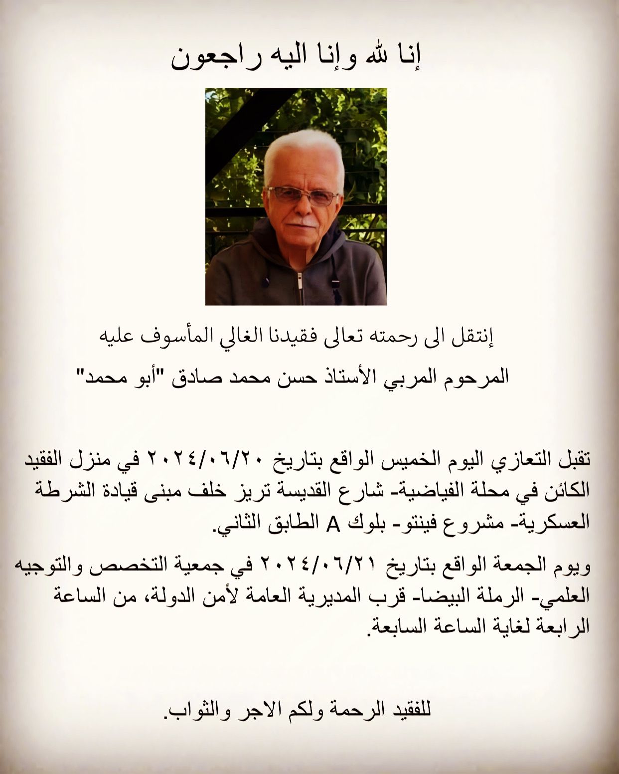 تُقبل التعازي بالمأسوف عليه المربّي المرحوم حسن محمد صادق (أبو محمد) اليوم الخميس 20 حزيران 2-24 في منزل الفقيد في الفياضية