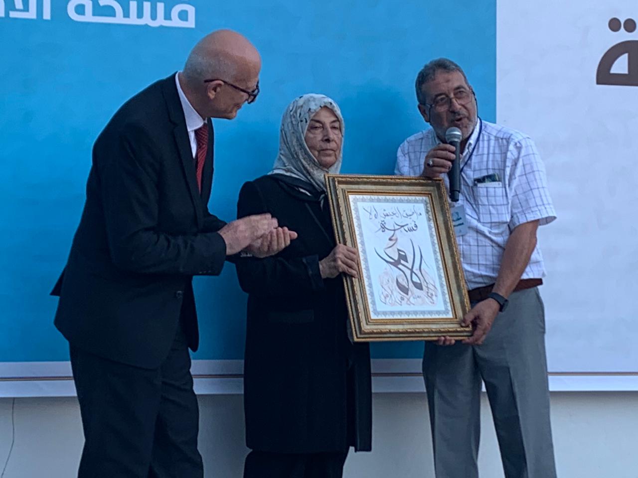 بعد ذلك قصت عباس وتقش الشريط التقليدي لافتتاح المعرض الذي يشارك فيه 40 رساما ورسامة ، ثم جرى توزيع شهادات تقديرية على الفنانين المشاركين، كما قدم تقش وبدر الدين لوحة فنية لممثلة راعي الاحتفال.