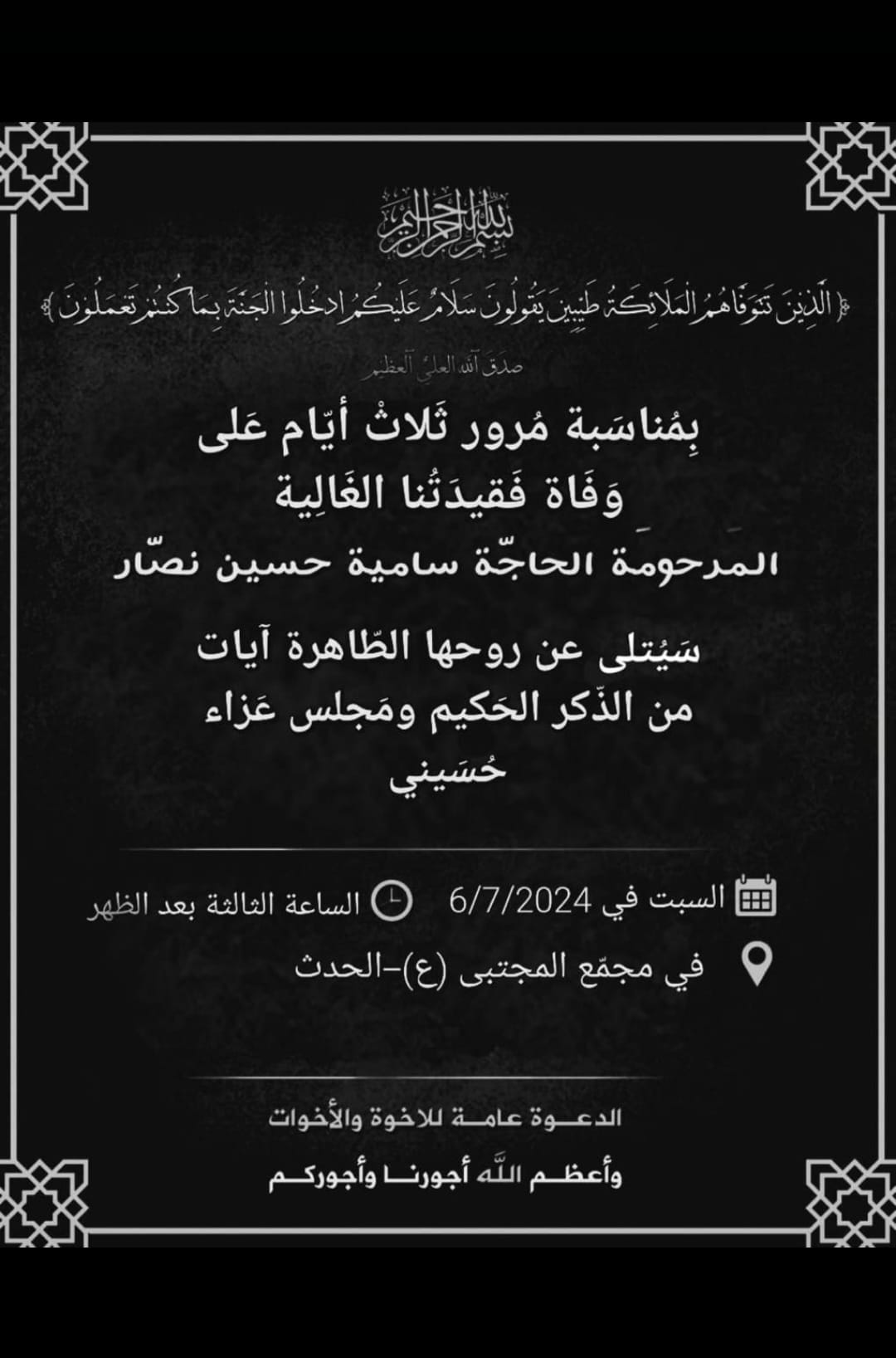 لهذه المناسبة الاليمة تتلى آيات من الذكر الحكيم ومجلس عزاء حسيني عن روحها الطاهرة عند الساعة الثالثة بعد ظهر يوم السبت في 6 تموز، 2024 في مجمع المجتبى (ع) الحدث.