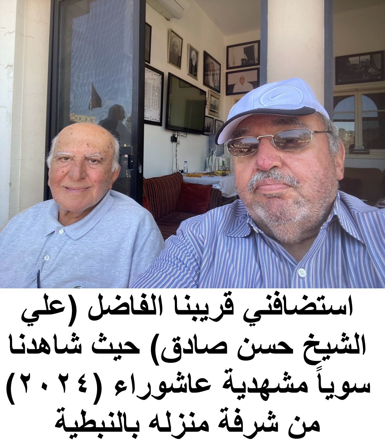 ومن ضمن فعاليات ذكرى عاشوراء (٢٠٢٤)، فقد حَلْلُتُ ضيفاً بالنبطية على قريبنا الفاضل (أبو حسن - علي الشيخ حسن عبدالحسين صادق)، حيث تابعنا سوياً من على شرفة منزله المُطل على مسرح بيدر النبطية، أداء مشهدية فاجعة الطف لهذا العام.