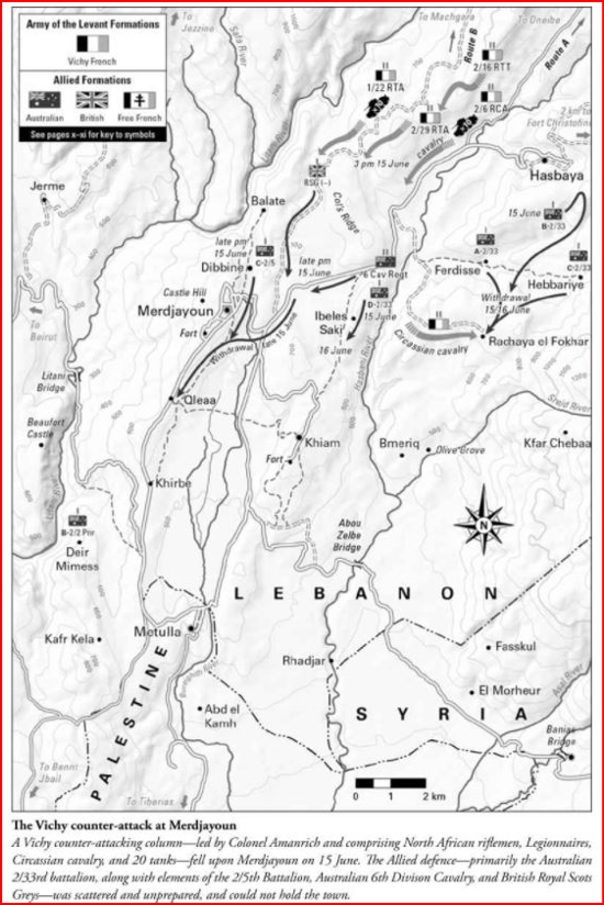 كما كتب الملازم ناجيل في يوميات الفوج الميداني 2/5 يصف بعض مما حدث في مرجعيون قائلاً:" تقدمت سيرا على الأقدام، فوجدت القوات البريطانية والأسترالية تنسحب جنوباً عبر مدينة مرجعيون، كان واضحاً ان أياً من المنسحبين لا يملك فكرة عما يجري، بالتأكيد باستثناء فرنسي فيشي.