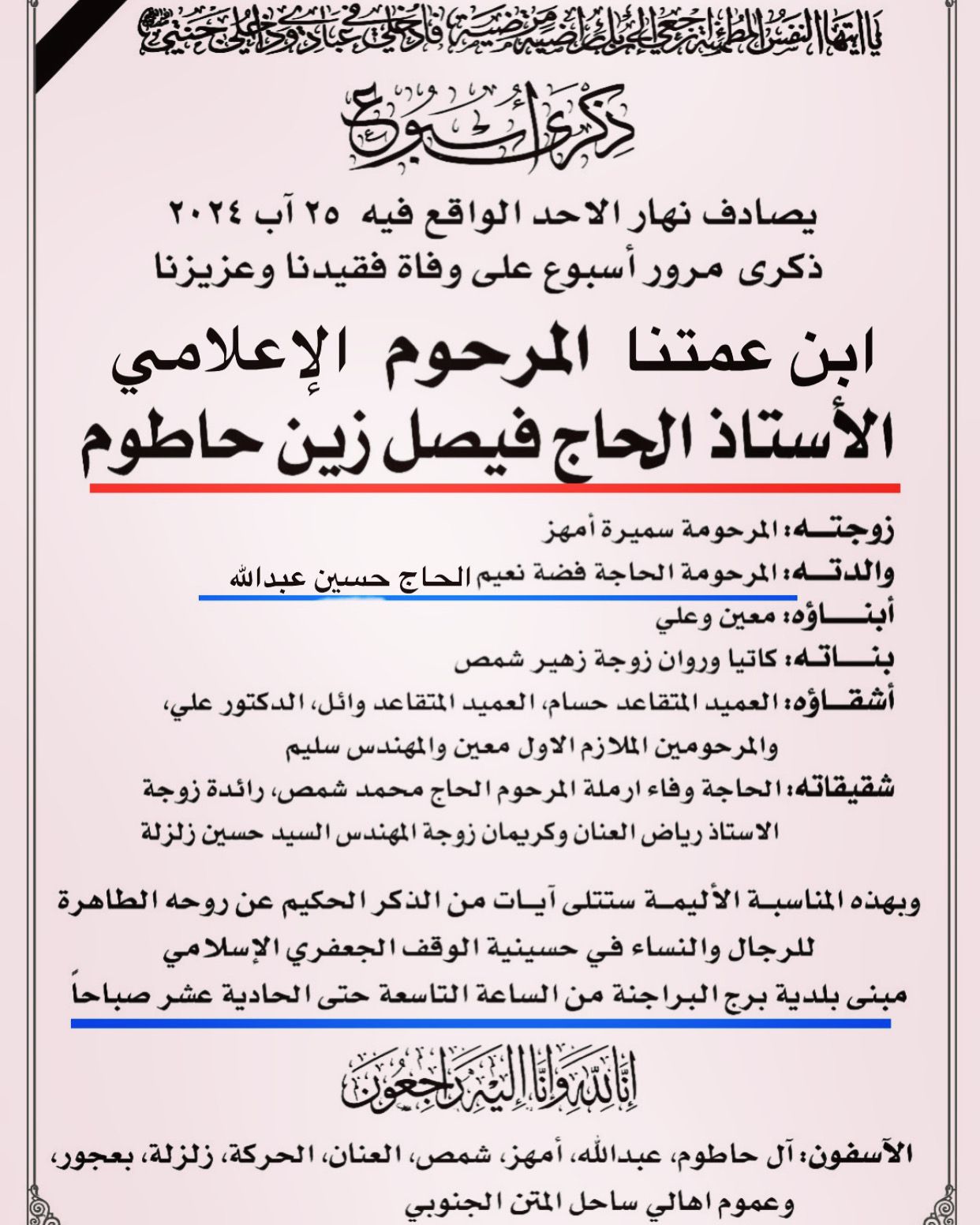 ستقام ذكرى الأسبوع من الساعة (٩:٠٠) صباحاً الى الساعة (١١:٠٠) قبل ظهر يوم الأحد الموافق (٢٥ آب ٢٠٢٤) للرجال والنساء، في مركز الوقف الاسلامي الجعفري - حسينية برج البراجنة - مبنى بلدية برج البراجنة، الضاحية الجنوبية.