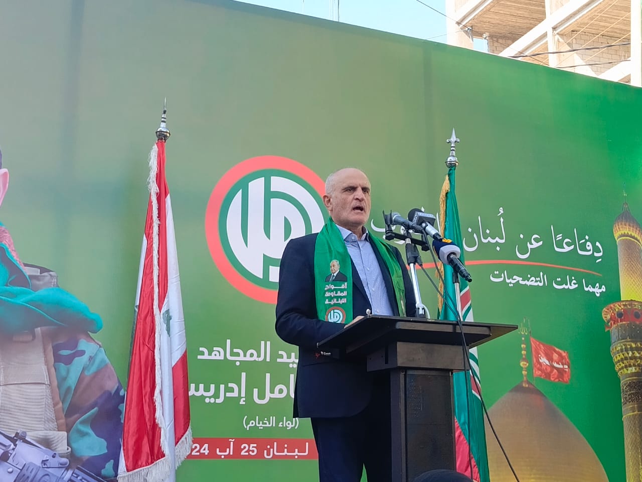 وقال:"كل قطرة دم تسقط تعني الكثير الكثير ليس للاهل فقط ، بل يجب ان تعني لكل اللبنانيين ، تسقط بعين الله ، هي من أجل كل المواطنين، كل اللبنانيين، عندما يستشهد ابناؤنا، أخوتنا انما يستشهدون دفاعا عن آخر لبناني مهما اختلفنا معه، او ألتقينا معه، لان مبادئنا ومقاومتنا هي من أجل كرامة الانسان في مواجهة عدو الانسانية الذي يرتكب المجازر المفتوحة، في فلسطين، في غزة، في الضفة الغربية وعلى امتداد حدودنا، نعم ردنا على الجرائم بمزيد من التمسك بالاهداف، لا نعمل برد الفعل والمقاومة واعية في ادارة التوازن بين عملها العسكري وبين الحركة السياسية التي يجب ان تواجه، وهي تواجه كل تقصير يتعلق بهذه المعركة ، نعم نحن معكم يا يا ابناء الامام الصدر ، يا ابناء افواج المقاومة اللبنانية "امل" ، يا كل اللبنانيين ، ننشد المقطع الثاني من نشيد حركة امل نحمي الاهداف الوطنية ، نصنع تاريخ الاجيال، وتاريخ الابطال ، ونعني معنى المسؤولية، المسؤولية ان ننفتح على كل جهد من اجل ردع اسرائيل وعدم التفريط بأي حق سيادي بما فيه حق الدفاع عن ارضنا وشعبنا ووطننا".