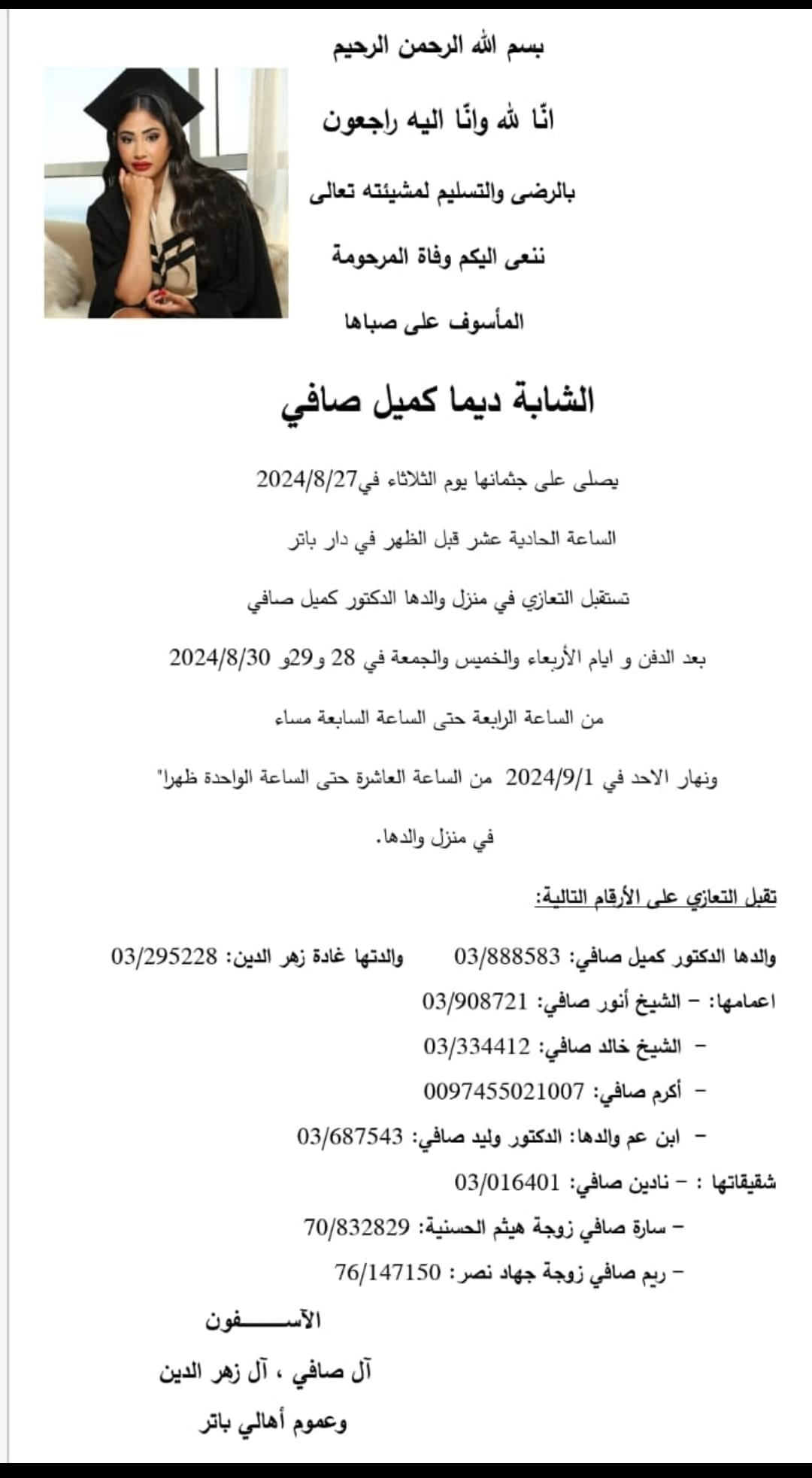 وصلي على جثمانها اليوم الثلاثاء الساعة الحادية عشر قبل الظهر في دار باتر بقضاء الشوف في لبنان.