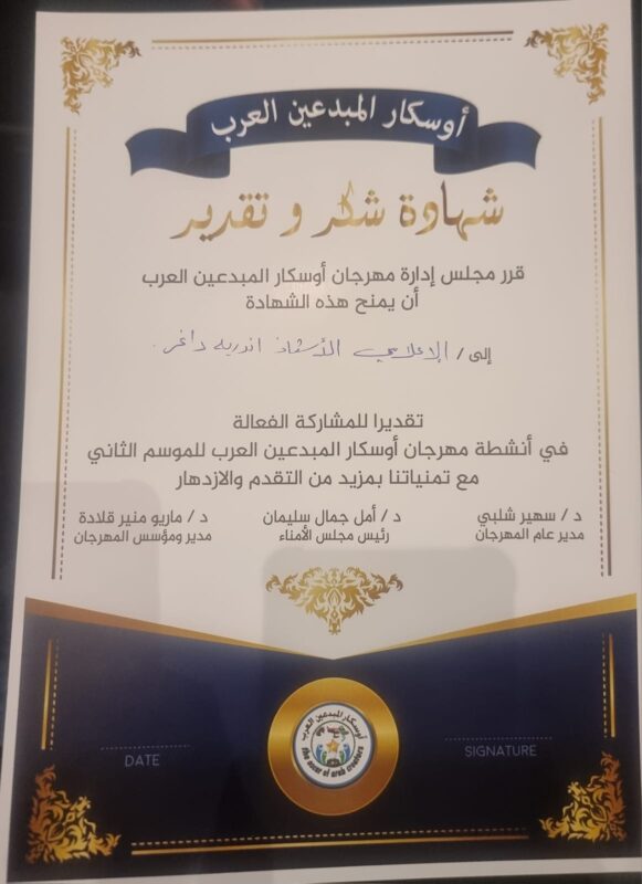 ويذكر أن "مهرجان اوسكار المبدعين العرب في لبنان" برعاية وزير الثقافة القاضي محمد وسام المرتضى، حيث شهد مركز الصفدي الثقافي في طرابلس حضوراً لشخصيات رسمية وأدبية واعلامية، في احتفالية نظمت اليوم في 31 آب الجاري.
