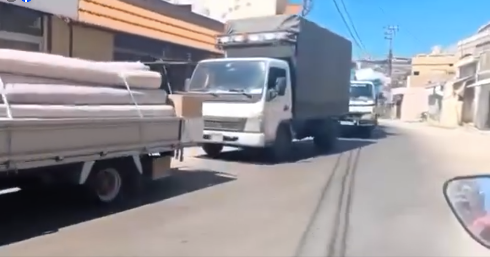 شاحنات محمّلة بالبضائع وهي تغادر بلدة ميس الجبل الحدوديّة الأسبوع الماضي