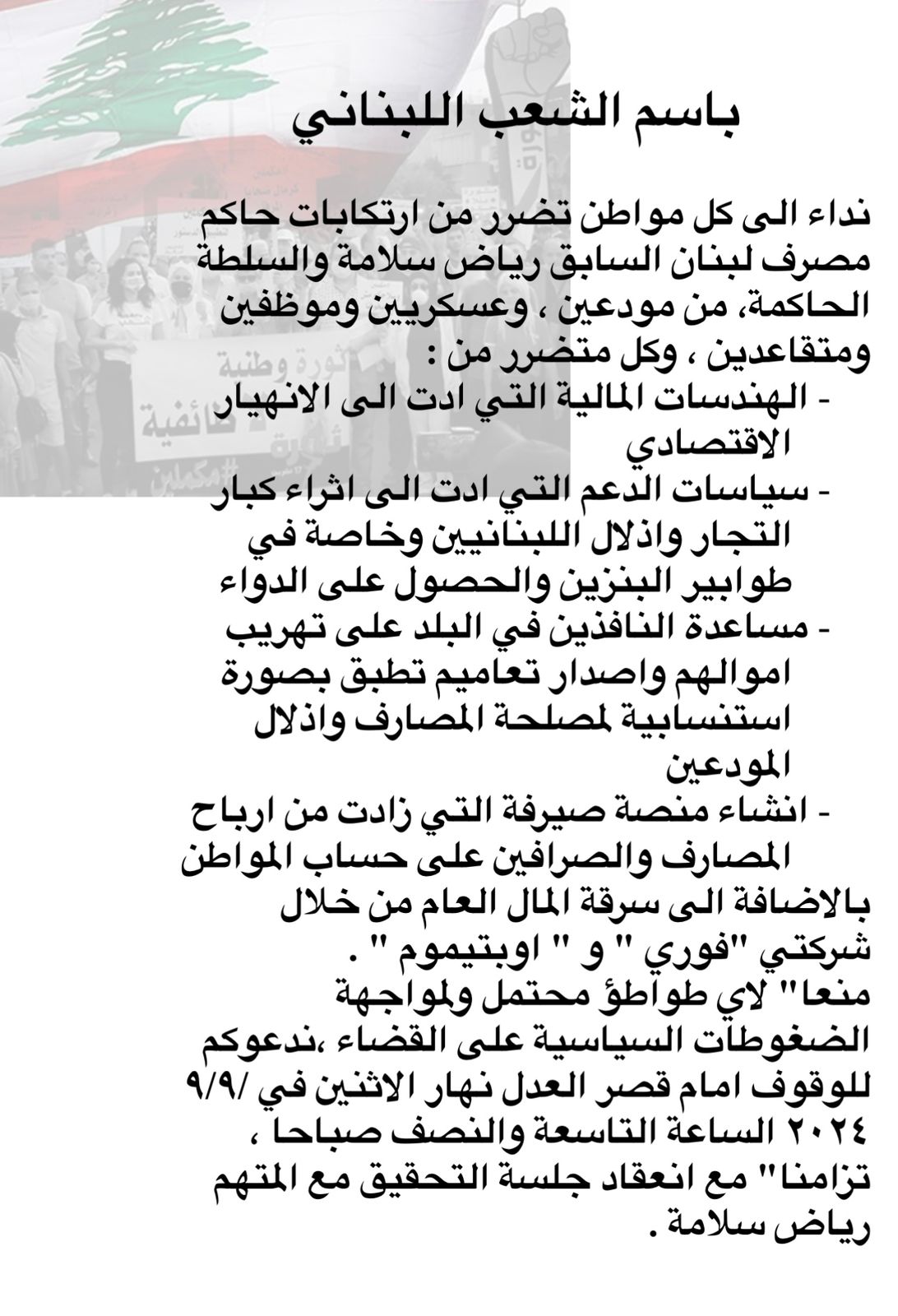 ان المجموعة المدعية في ملف اوبتيموم تدعو جميع المواطنين المتضررين من ممارسات الحاكم السابق لمصرف لبنان رياض سلامة ، وخاصة المودعين والمتقاعدين والموظفين الى وقفة امام قصر العدل منعا لاي تواطؤ محتمل قد يؤدي الى اخلاء سبيل سلامة .