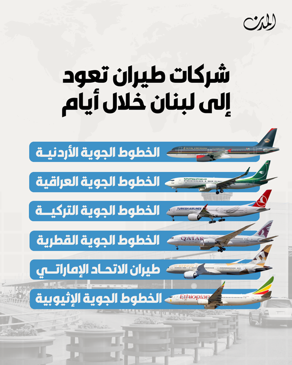 ومع وقف إطلاق النار واقتراب موسم أعياد الميلاد ورأس السنة قررت العديد من شركات الطيران استئناف رحلاتها إلى لبنان ومنها الطيران العراقي الذي عاد بالفعل إلى تسيير رحلات بين بغداد وبيروت، ومن المتوقع أن يستأنف الطيران التركي والقطري والمصري والإثيوبي والأردني رحلاته إلى لبنان في الأيام القليلة المقبلة.