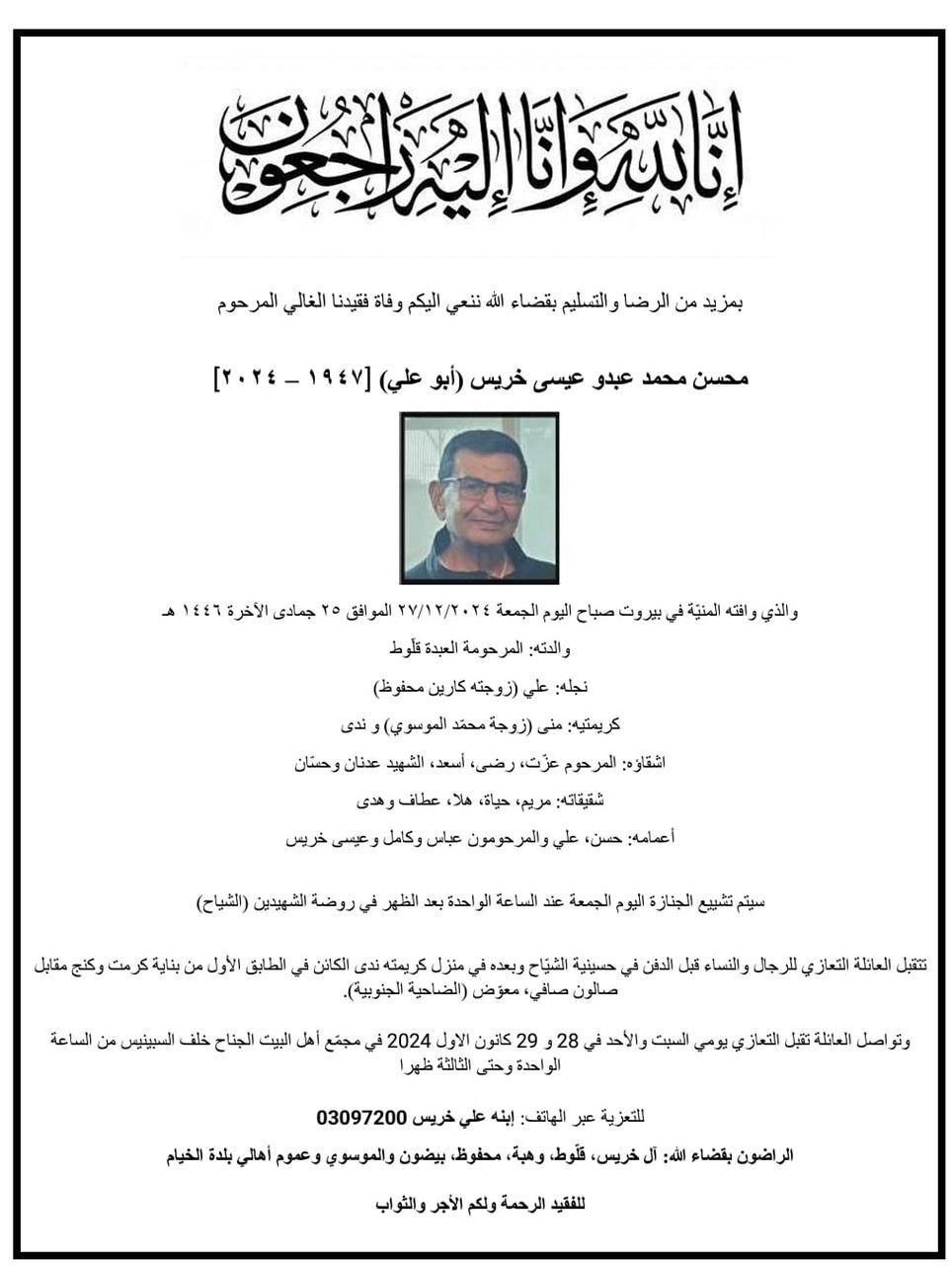 تتقبل عائلة المرحوم أبو علي محسن محمد علي عبدو عيسى خريس واجبات العزاء والمواساة للرجال والنساء، من الساعة الواحدة الى الساعة الثالثة من بعد ظهر يومي السبت والأحد (٢٨) و(٢٩) كانون الاول (٢٠٢٤) وذلك في مجمع اهل البيت (خلف سوبر ماركت Spinneys) - محلة الجناح - بيروت.