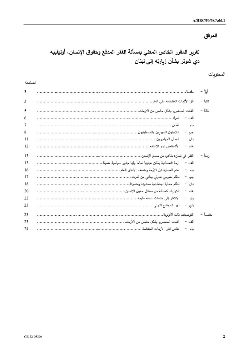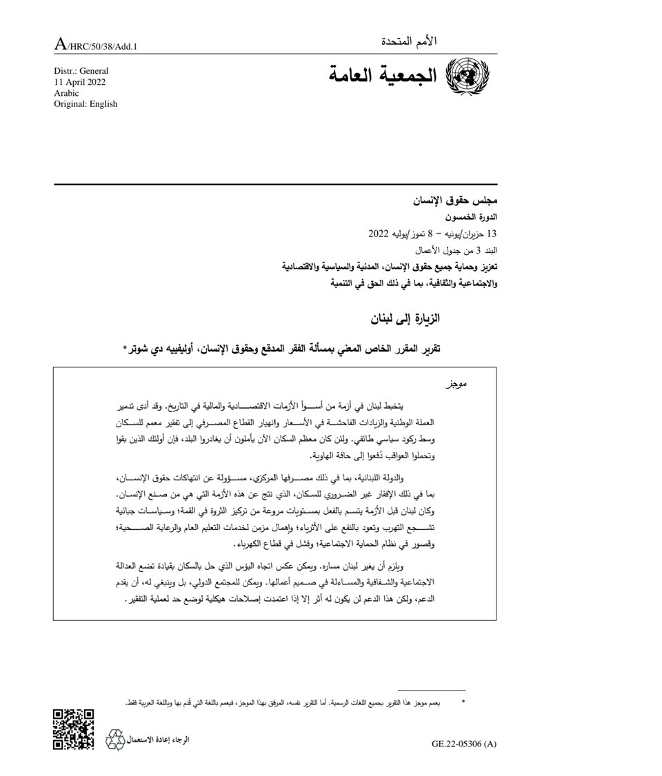ثالثا: من جهة ثانية ، و على سبيل التوضيح والتأطير في سياق متصل بموضوعه وأهدافه ومراحله ،تأكيدا لاهميته، فان تقرير السيد دي شوتر بنتيجة زيارته الى لبنان من ١ الى ١٢ نوفمبر ٢٠٢٢(المستند الى قرار مجلس حقوق الانسان رقم ١٣٤٤ ) قد جرى استعراضه في الدورة الخمسين لمجلس حقوق الانسان المنعقدة من ١١٦ الى ٨٧ ٢٠٢٢،كبند أول من جدول اعمال هذا المجلس بموضوع ” تعزيز وحماية جميع حقوق الانسان المدنية والسياسية والاقتصادية والاجتماعية والثقافية بما في ذلك الحق في التنمية”، وتحت عنوان ” الزيارة الى لبنان- تقرير المقرر الخاص المعني بمسألة الفقر المدقع وحقوق الانسان- اوليفييه دي شوتر.“