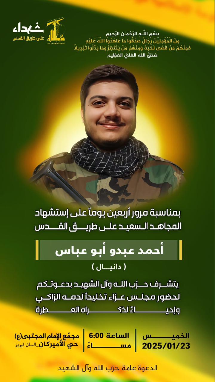 لمناسبة مرور أربعين يوماً على استشهاد المجاهد على طريق القدس، المأسوف على شبابه أحمد عبدو أبو عباس، يقام مجلس عزاء تكريماً لدمّه الزاكي وإحياءً لذكراه العطرة.
