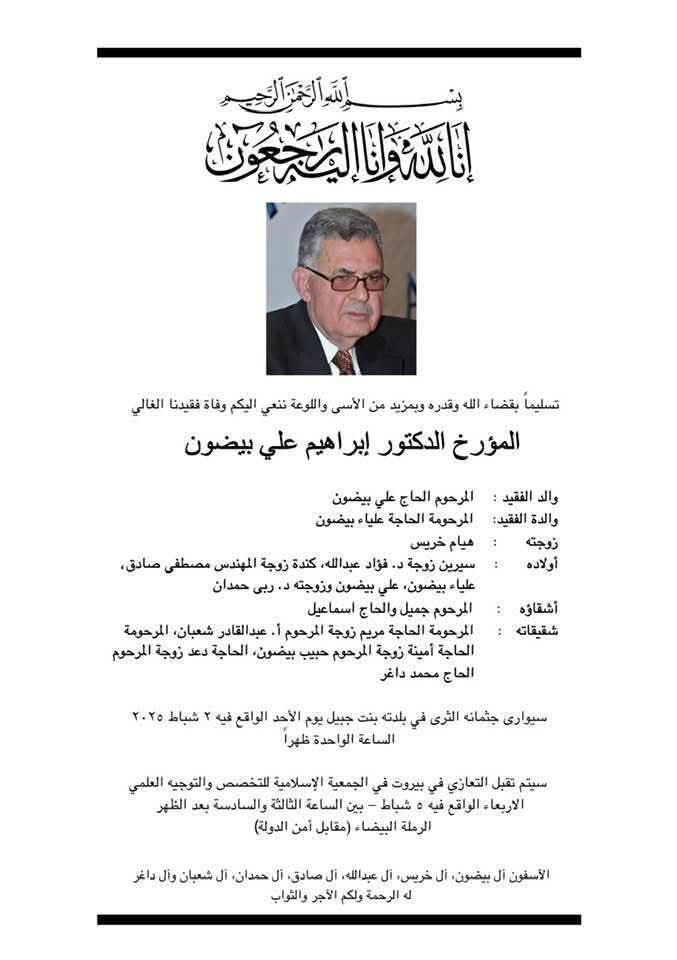 ستوارى جنازة الراحل الثرى في مدينته بنت جبيل يوم الأحد الواقع في 2 شباط 2025 الساعة الواحدة ظهراً