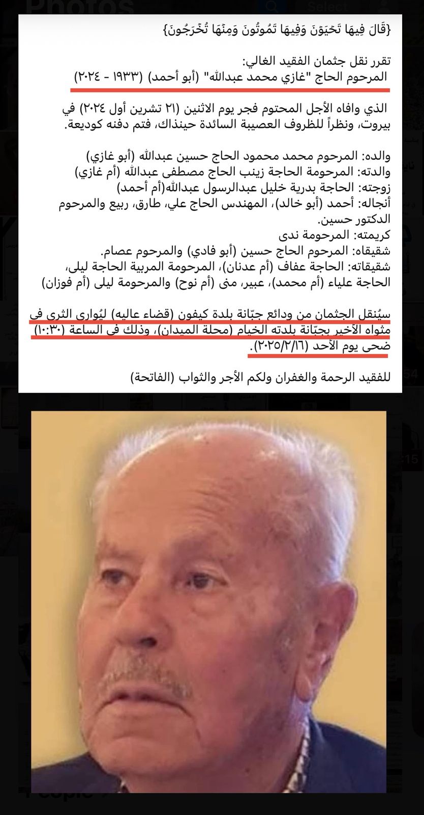 سيُنقل الجثمان من ودائع جبّانة بلدة كيفون (قضاء عاليه) ليُوارى الثرى في مثواه الأخير في جبّانة بلدته الخيام (محلة الميدان)، وذلك في الساعة (١٠:٣٠) ضحى يوم الأحد (٢٠٢٥/٢/١٦).