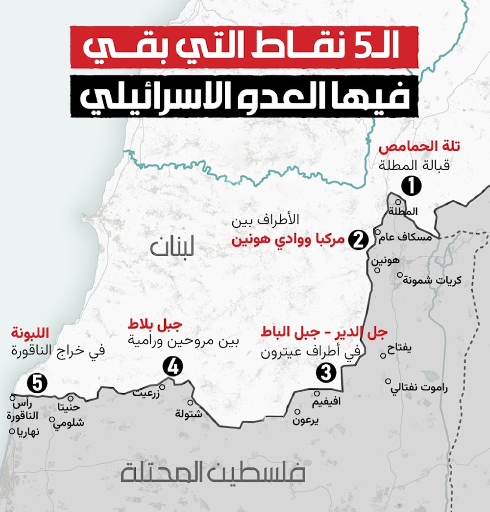 التحركات العسكرية رُصدت خلف الجدار داخل الأراضي المحتلة، إضافة إلى ورشة أشغال في الجدار عند محلة العبارة. وقال مصدر مطّلع لـ«الأخبار» إن «بولفار العديسة وجدار كفركلا وطريق المطلة حتى الحمامص منطقة مقطوعة على نحو مؤقت رضوخاً لطلب إسرائيل من اللجنة الخماسية بذريعة حاجتها إلى تنفيذ ترتيبات أمنية وضمان انتشار الجيش واليونيفل على التلال المشرفة على مستعمرات مسكاف عام وكريات شمونة والمطلة المكشوفة بشكل كامل للجانب اللبناني». داخل العديسة وكفركلا، لم يسمح الأهالي للعدو بالتشويش على فرحة العودة، فانتشروا في الأحياء المدمرة بحثاً عن جثامين الشهداء وآثارهم.