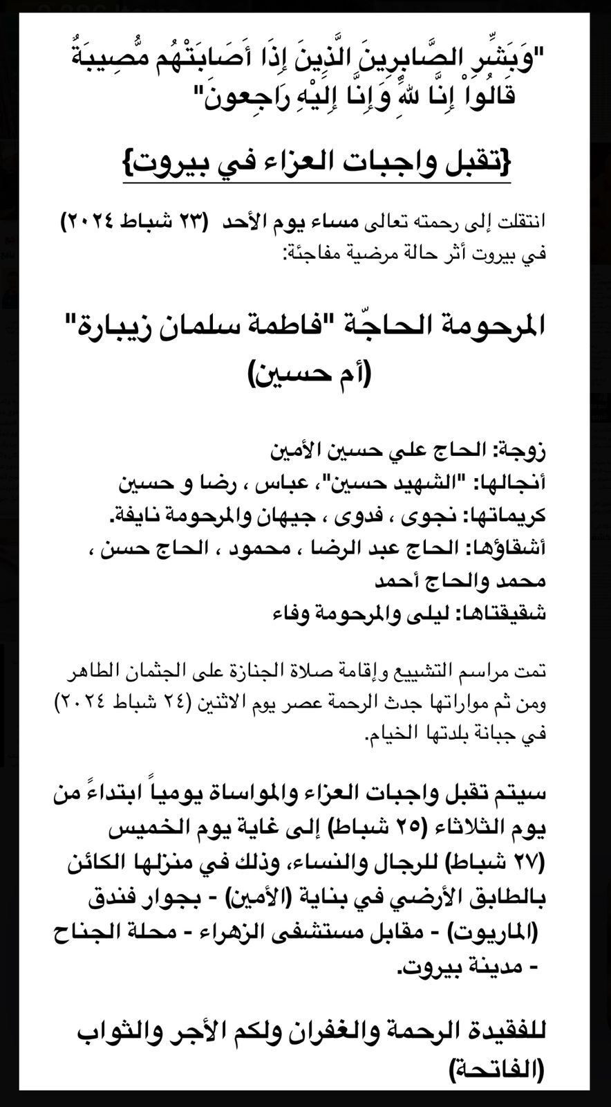 تتقبل عائلة المرحومة المأسوف عليها الحاجّة فاطمة سلمان زيبارة (أم حسين الأمين)، زوجة: الحاج علي حسين الأمين، واجبات العزاء والمواساة يومياً من ابتداءً من يوم الثلاثاء (٢٥ شباط) إلى غاية يوم الخميس (٢٧ شباط) للرجال والنساء، وذلك في منزلها الكائن بالطابق الأرضي في بناية (الأمين) - بجوار فندق (الماريوت) - مقابل مستشفى الزهراء - محلة الجناح - مدينة بيروت.
