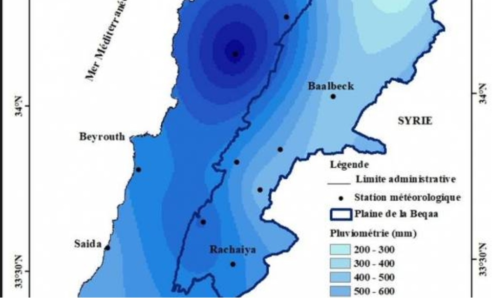 ويستطرد "يستنتج أن كمية الأمطار تهطل في فترات قصيرة وخلال أيام معدودة تقريبا في فصل الشتاء، حيث يتراوح متوسطها بين 650 إلى 1000 ملم على الساحل، وترتفع إلى أكثر من 1270 ملم في المرتفعات الجبلية. أما مناطق البقاع، فهي أكثر جفافاً وتتلقى كميات قليلة من الأمطار، تتراوح بين 380 إلى 640 ملم. وعلى قمم الجبال الأعلى، تهطل هذه الأمطار على شكل ثلوج كثيفة تظل حتى أوائل الصيف. وهي المورد الأساسي لتعبئة خزانات المياه الجوفية، التي يعتمد عليها في غالبية المدن الساحلية، وكذلك بالنسبة للزراعة والري في مناطق السهول، وبخاصة في سهل البقاع والمناطق الداخلية، حيث تنخفض كميات المياه وينتشر الجفاف (مناطق البقاع الشمالي)".