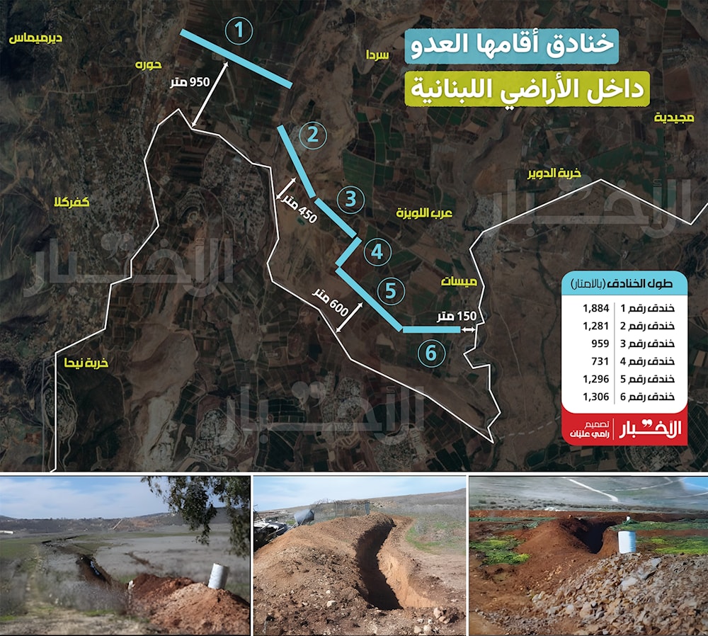 وفي تصعيد جديد ولافت، أقدم العدو في منطقة سهل الخيام وسردا في القطاع الشرقي على حفر خنادق داخل الأراضي اللبنانية، بعضها يبعد كيلومتراً عن السياج الحدودي، فيما لا يتجاوز البعض الآخر مئات الأمتار، ويمتدّ طول هذه الخنادق إلى نحو سبعة كيلومترات.