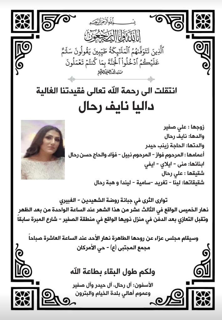 تتقبّل أسرة المرحومة التعازي، بعد الدفن، في منزل ذويها الكائن في محلة الصفير - شارع المبرة سابقاً.