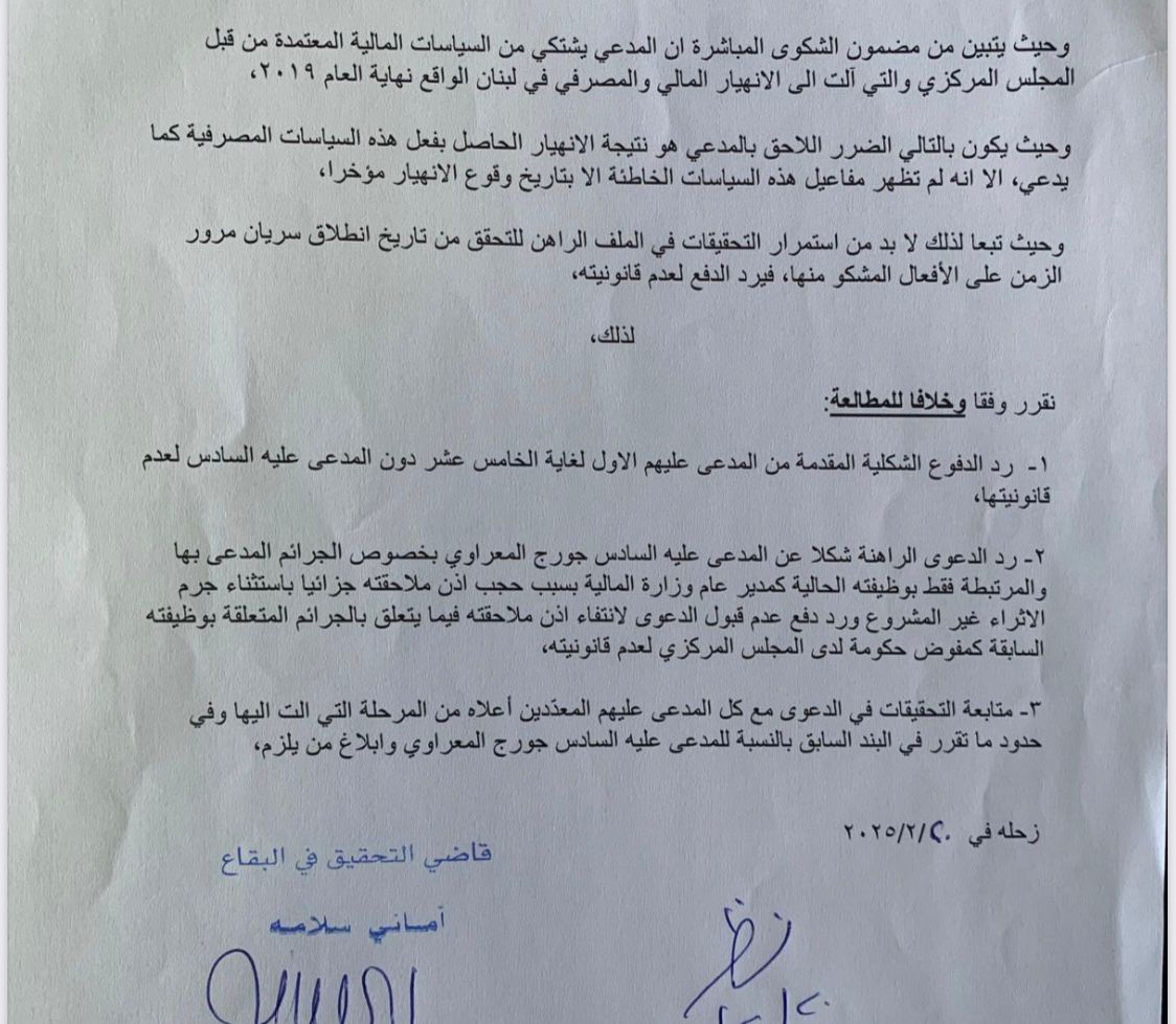 وكانت القاضية سلامة قد أصدرت بتاريخ ٢٠ شباط ٢٠٢٥ قراراً برد الدفوع الشكلية للمدّعى عليهم، وسيم منصوري وبشير يقظان وسليم شاهين والكسندر ماراديان ومحمد أبو حيدر وجورج المعراوي وعليا عباس وآلان بيفاني ومجيد جنبلاط وكريستيل واكيم ورائد شرف الدين ومحمد البعاصيري وسعد العنداري وفهيم معضاد وفادي مكي، والذين قاموا باستئناف هذا القرار أمام الهيئة الاتهامية في البقاع، بانتظار البت بطعونهم الاستئنافية، علماً بأن القاضية سلامة قبلت جزئياً دفوع المدّعى عليه المعراوي بشأن الجرائم المرتبطة فقط بوظيفته الحالية كمدير عام لوزارة المال بسبب حجب إذن ملاحقته جزائياً من قبل وزير المال، باستثناء جرم "الإثراء غير المشروع"، فيما ردّت الدفع بعدم قبول الدعوى الذي تقدّم به في ما يتعلّق بوظيفته السابقة كمفوّض للحكومة لدى المجلس المركزي لعدم قانونيته.