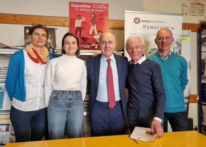 الدكتور كامل مهنا (في الوسط في الصورة)، الرئيس المؤسس لمؤسسة عامل الدولية والمنسق العام لشبكة المنظمات غير الحكومية العربية واللبنانية، كان في زيارة إلى مدينة غرونوبل في مقر عامل فرنسا (جمعية هيوماكوب - عامل فرنسا) الصورة من صحيفة لو دوفينيه ليب