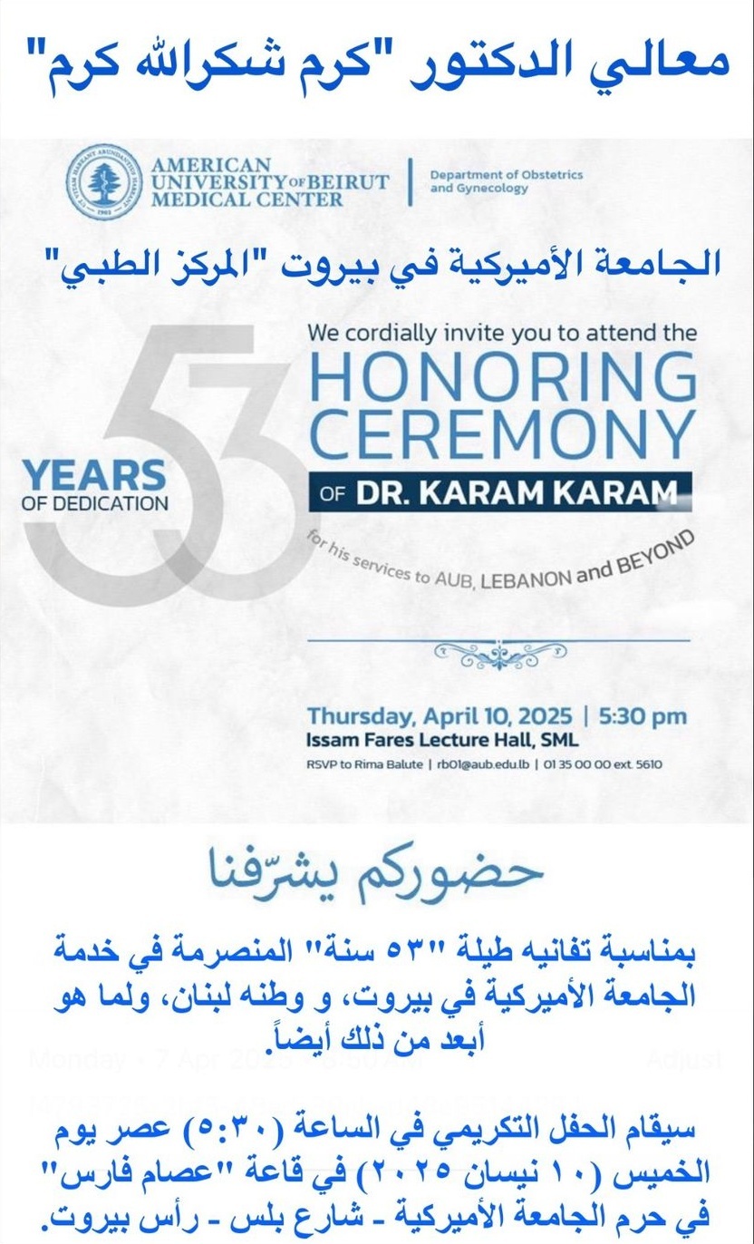 تقديرًا لتفانيه وإخلاصه في خدمة أبناء وطنه والإنسانية جمعاء، وعلى مدار 53 عامًا من العطاء المتواصل في مستشفى الجامعة الأميركية في بيروت، يُقام حفل تكريمي للدكتور كرم شكرالله كرم، الوزير السابق، وذلك في تمام الساعة الخامسة والنصف من عصر يوم الخميس الموافق 10 نيسان 2025 في قاعة "عصام فارس" في حرم الجامعة الأميركية في بيروت، شارع بلس، رأس بيروت.