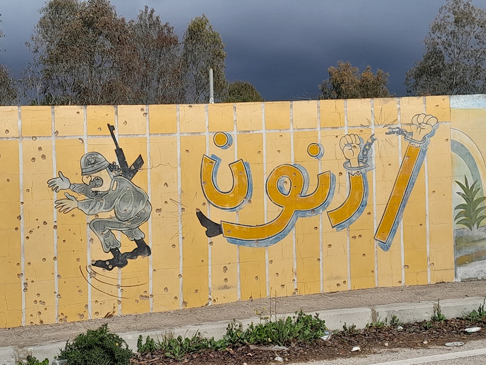 في الطريق صعوداً إلى «القلعة»، تبدو آثار شظايا قذيفة إسرائيلية على جدار خَطَّ عليه تلامذة قبل سنوات كلمة «أرنون» مع رسومات عن المقاومة والأرض.